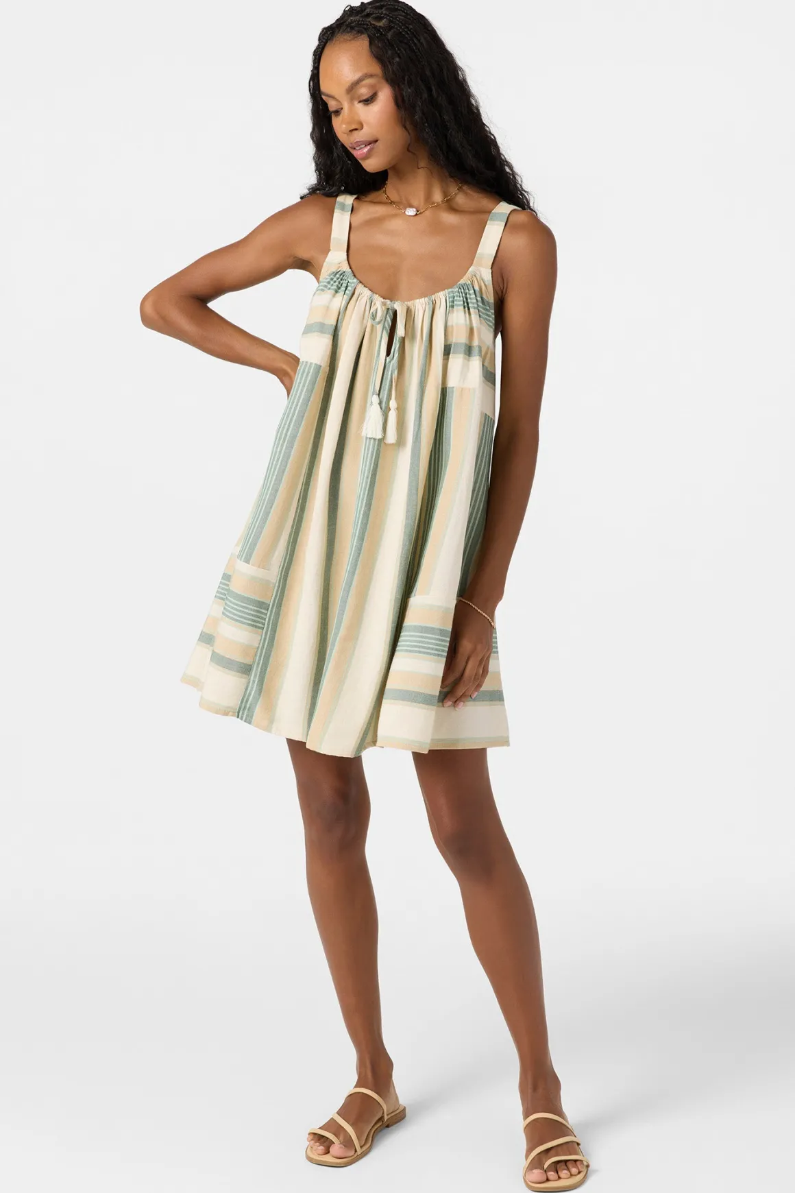 Embrace the easy days in our breezy mini dress, a perfect blend of comfort and laid-back style. Its flowy fit and artful stripe blocking create an effortless look, while the subtle tie-neck adds just the right touch for your sunny day adventures.