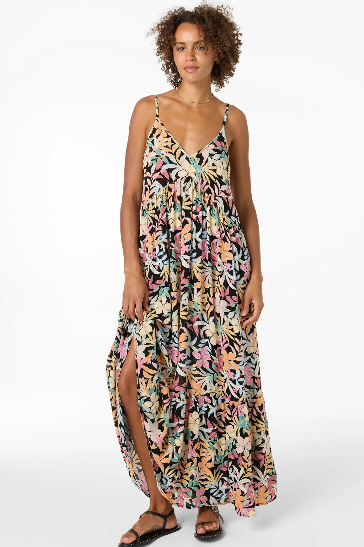 A woven maxi dress that you’ll adore. Features a colorful print design, racerback with adjustable straps, and flowy fit.