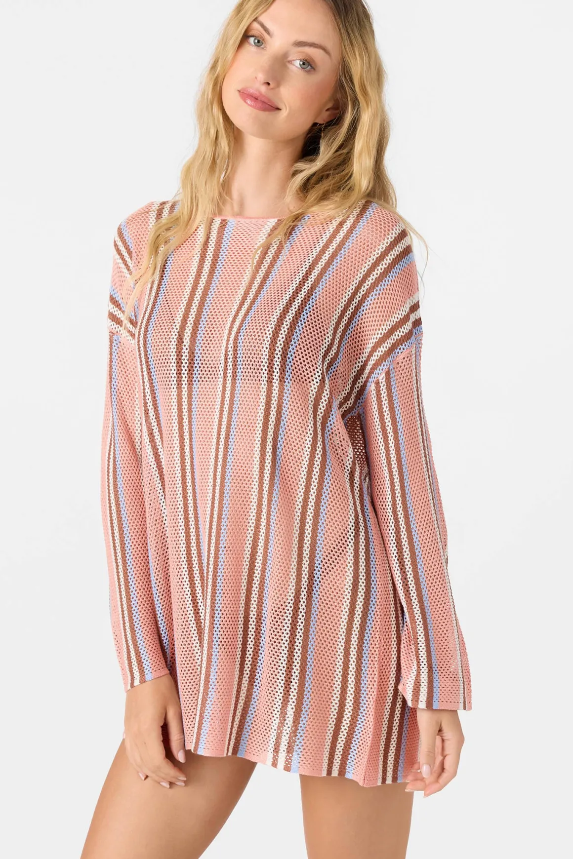 Drift effortlessly from beachside bliss to sunset soirées in this breezy and unique beach dress. It features a striped crochet design and flowy fit.
