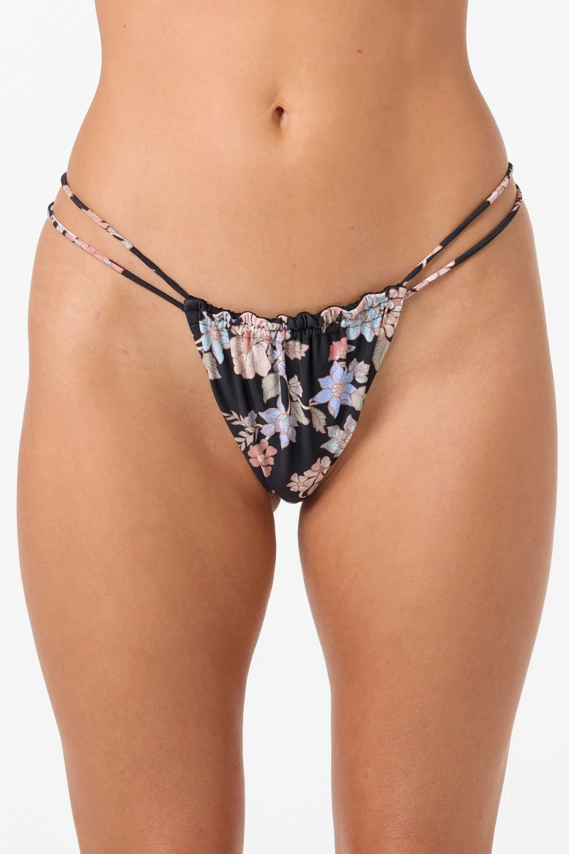 This floral print swim bottom has skimpy coverage, and spaghetti style straps.