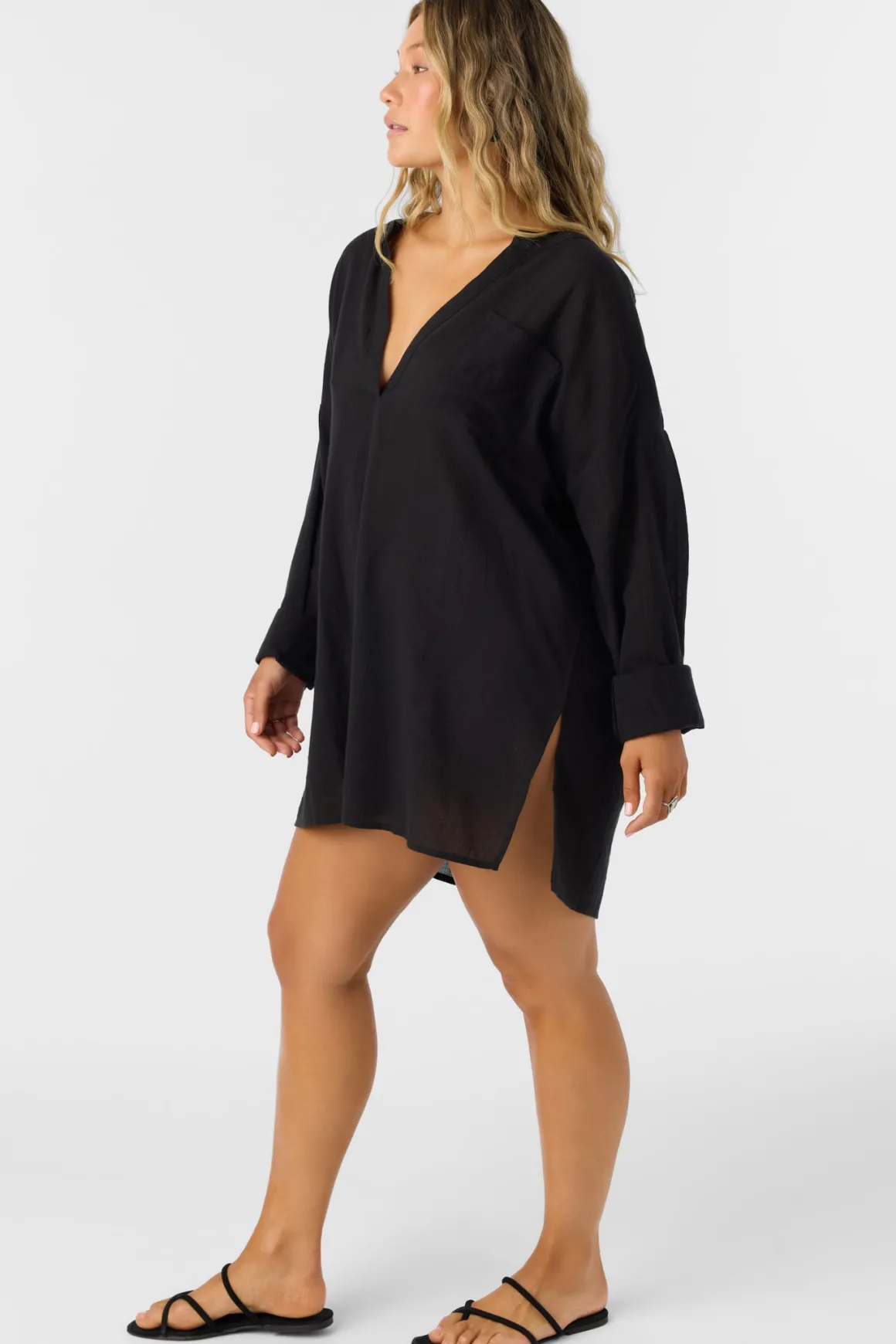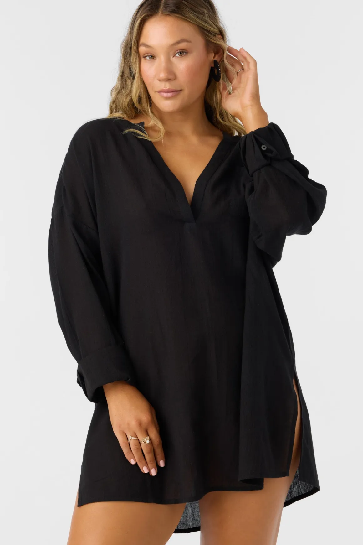A flowy cover-up to elevate your beach look. It has a long sleeve design, saddle cut hem and v-neckline.