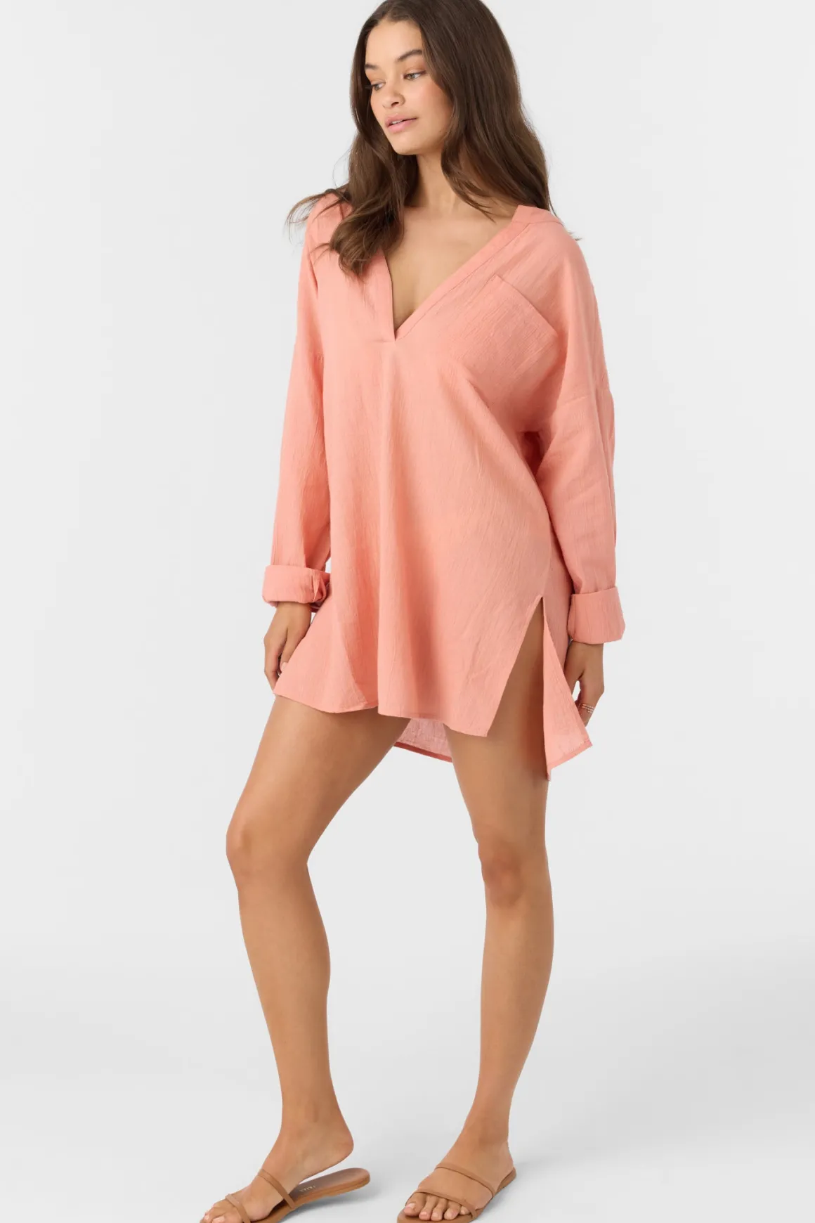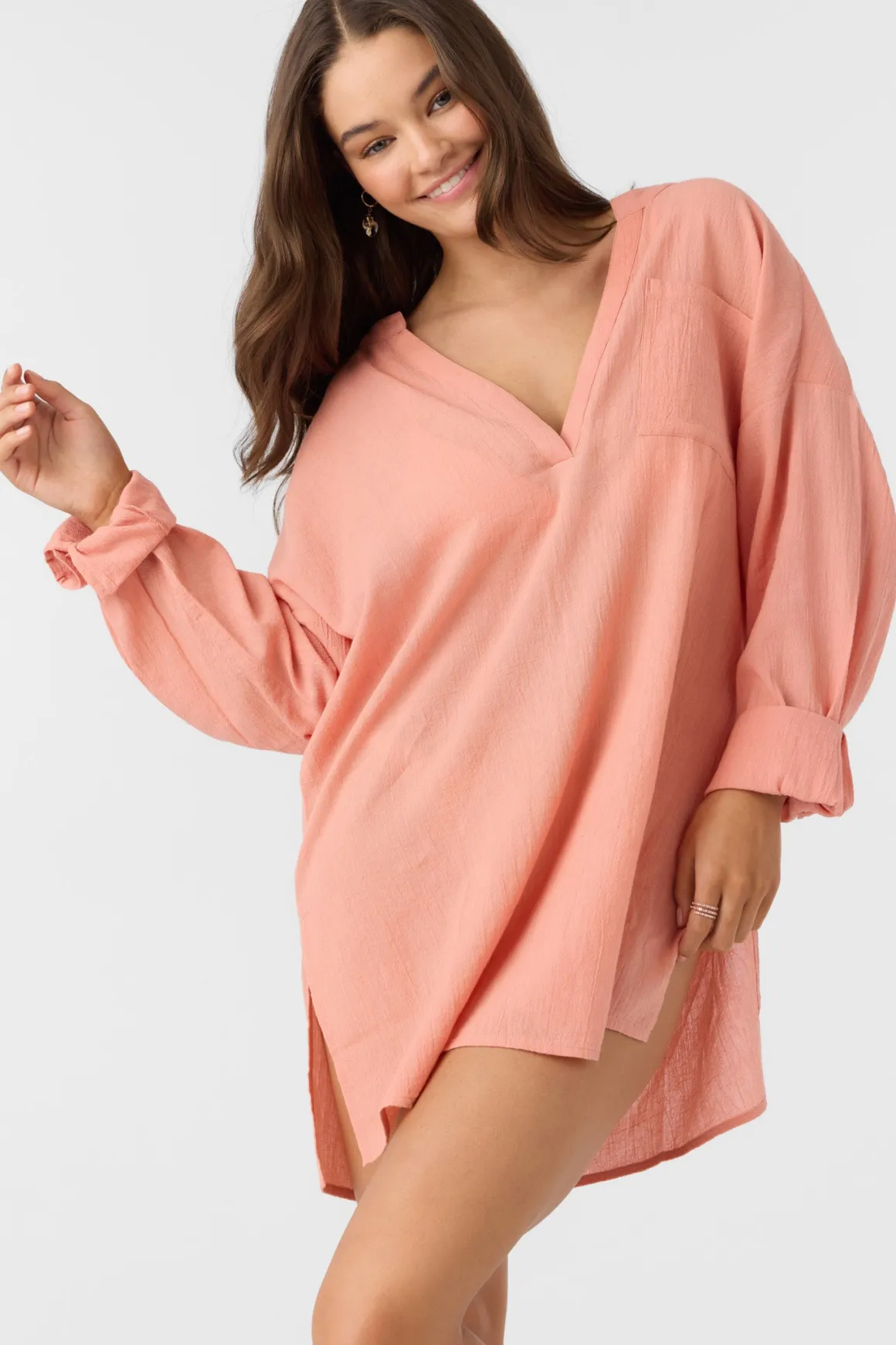 A flowy cover-up to elevate your beach look. It has a long sleeve design, saddle cut hem and v-neckline.
