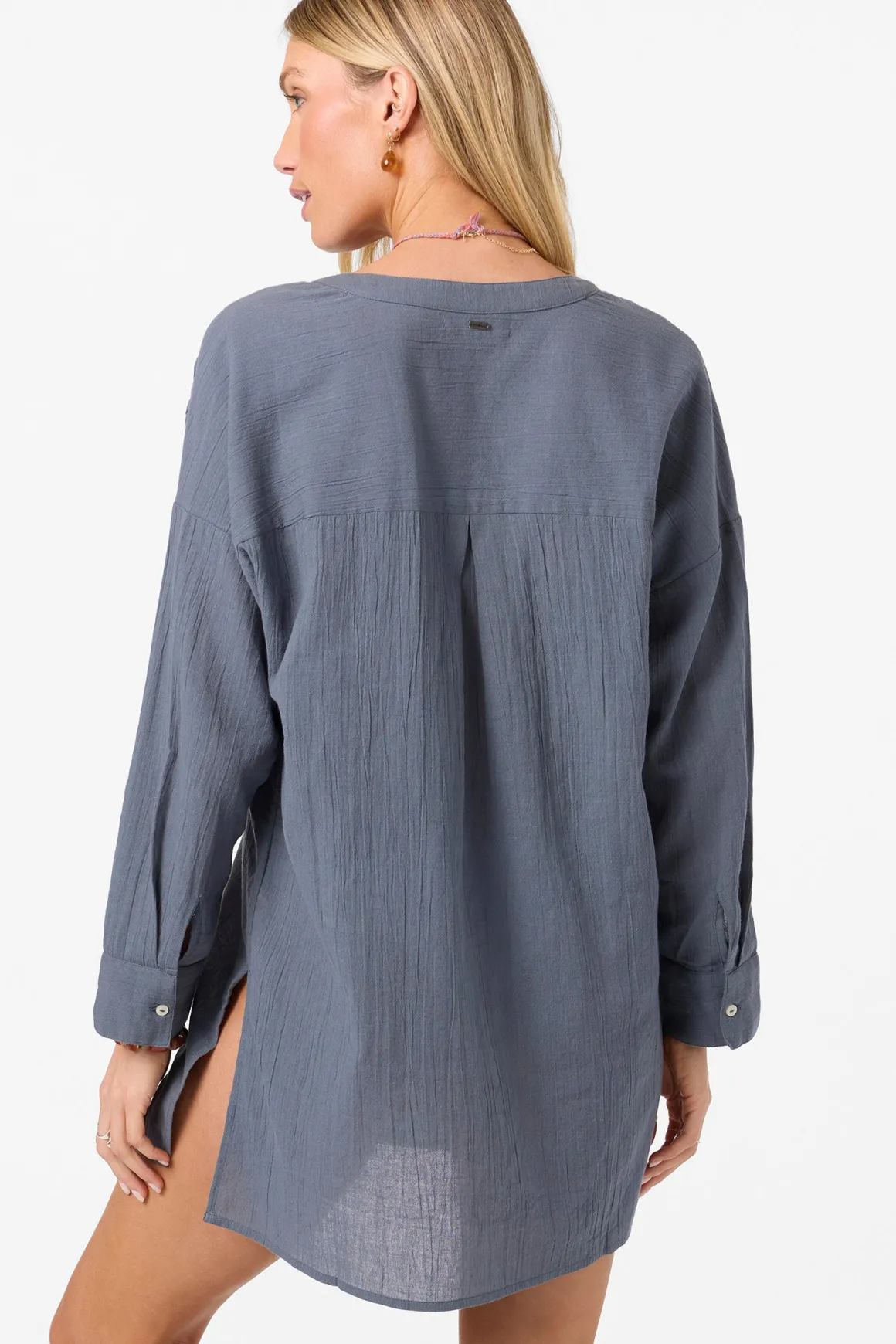 A flowy cover-up to elevate your beach look. It has a long sleeve design, saddle cut hem and v-neckline.