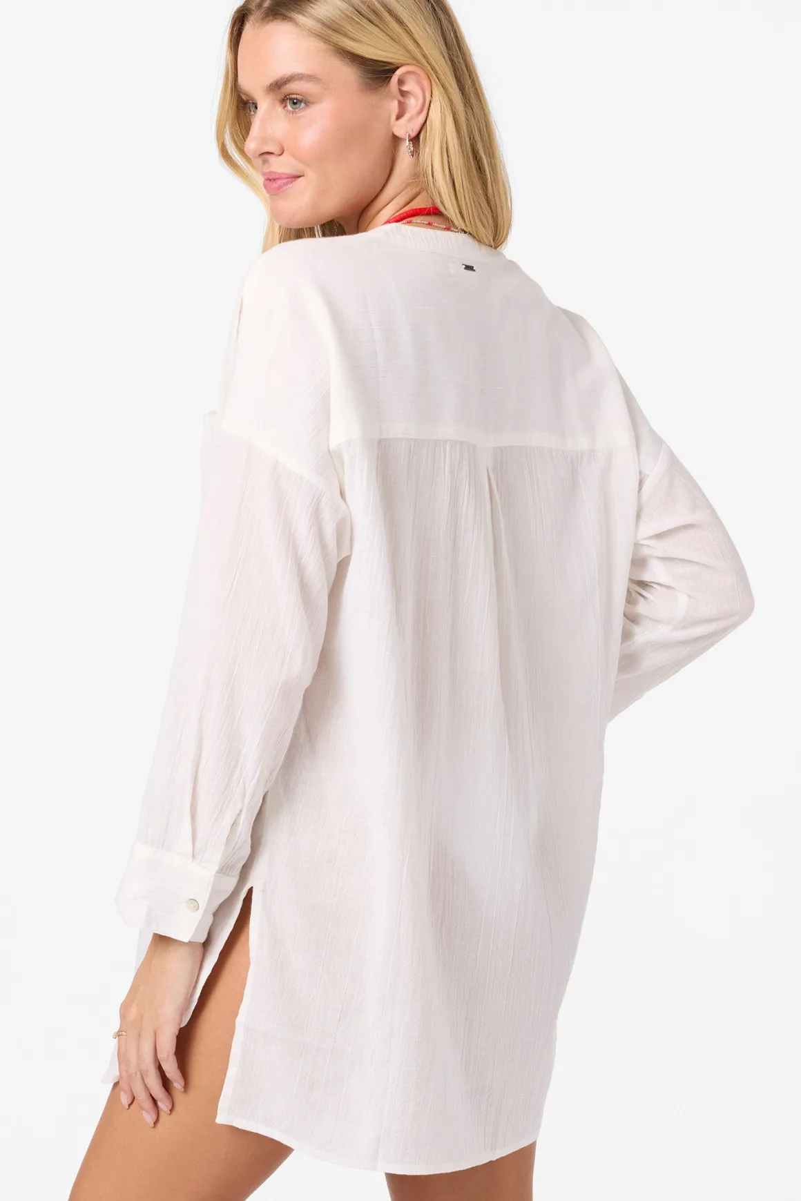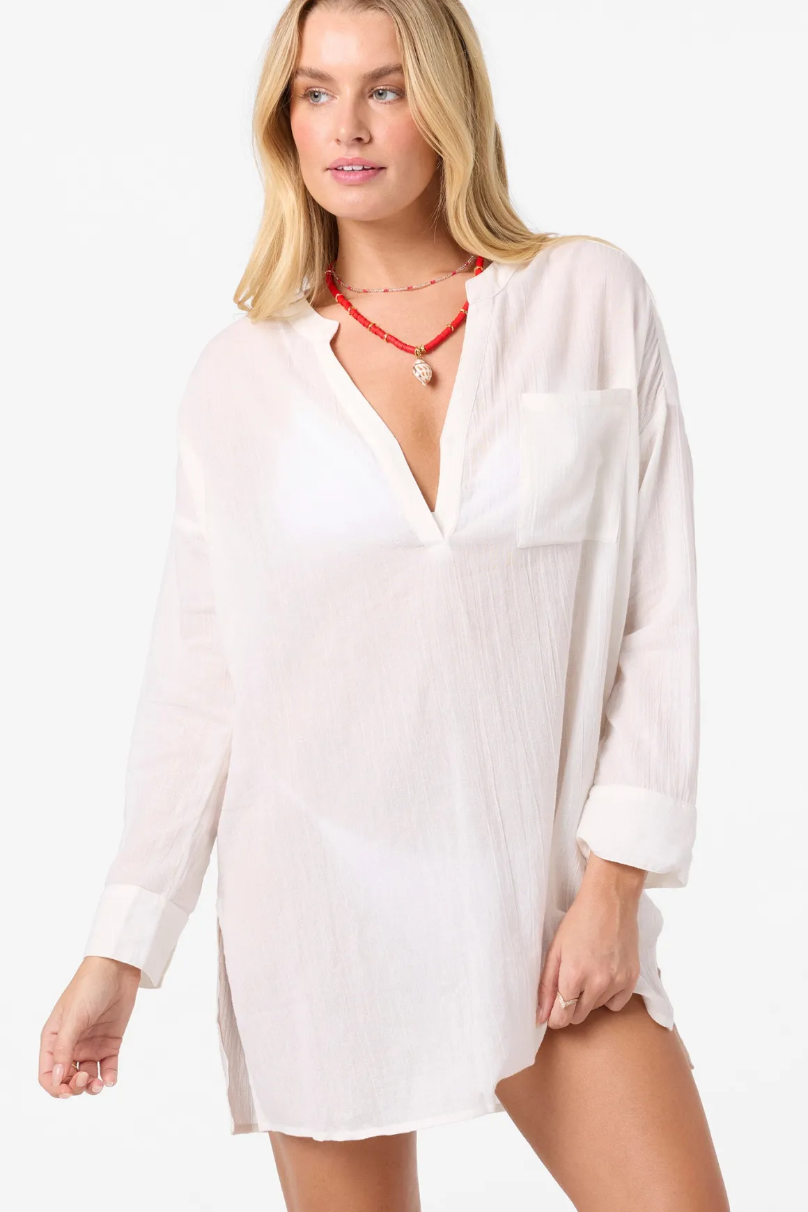 A flowy cover-up to elevate your beach look. It has a long sleeve design, saddle cut hem and v-neckline.