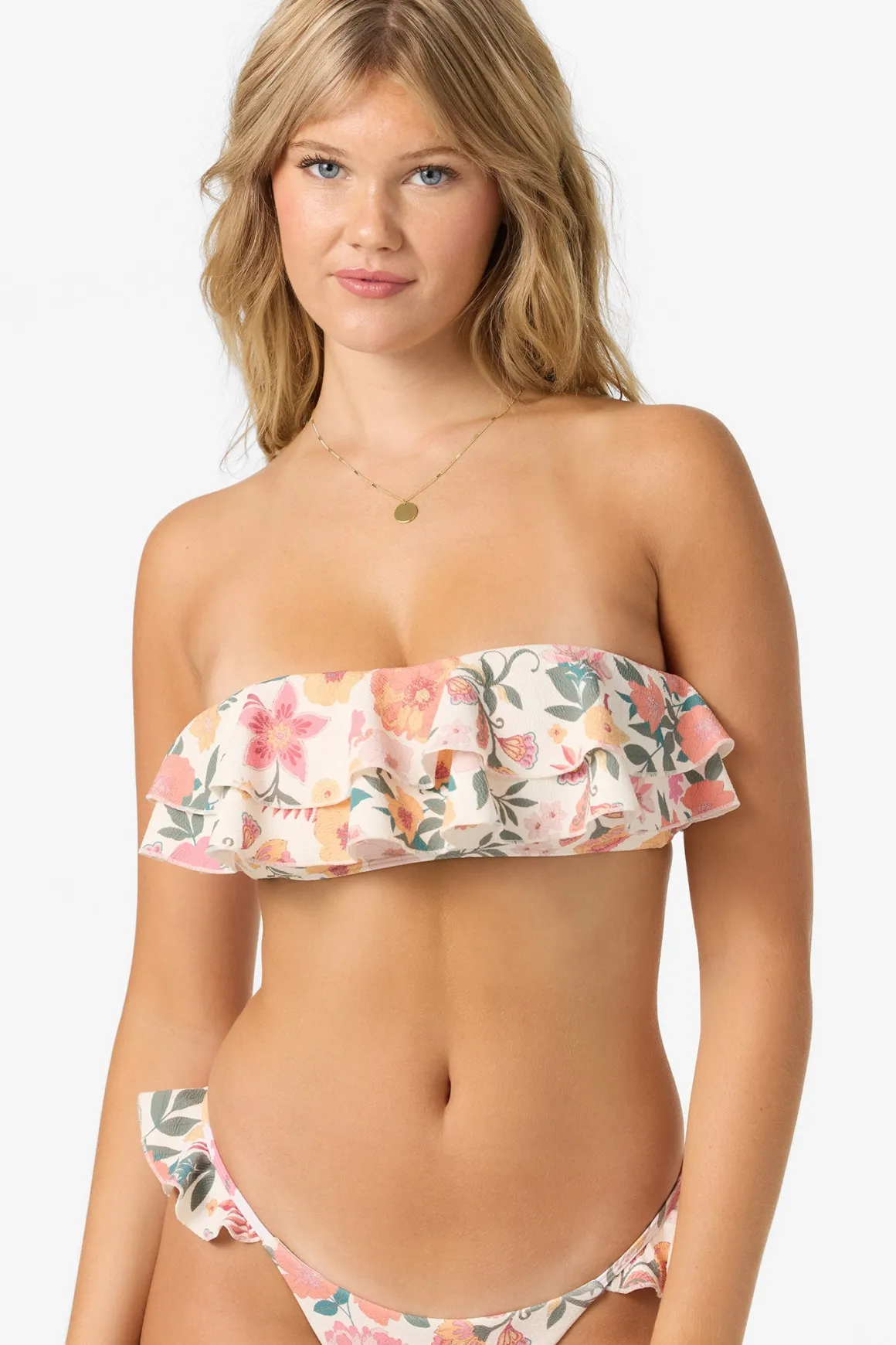 Ready for your next beach day! This bandeau bikini top features a ruffle design, hook back closure and allover print.