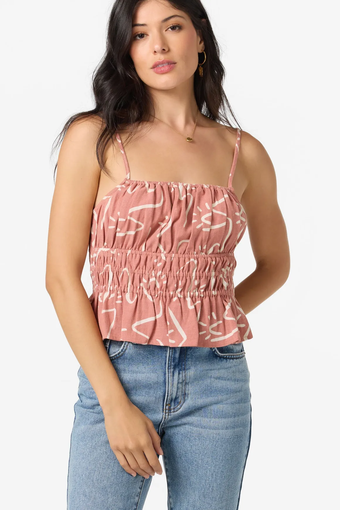 Light, breezy, and oh so sweet, this woven tank features delicate elastic details and an easy fit, made for sunlit days and salty air.
