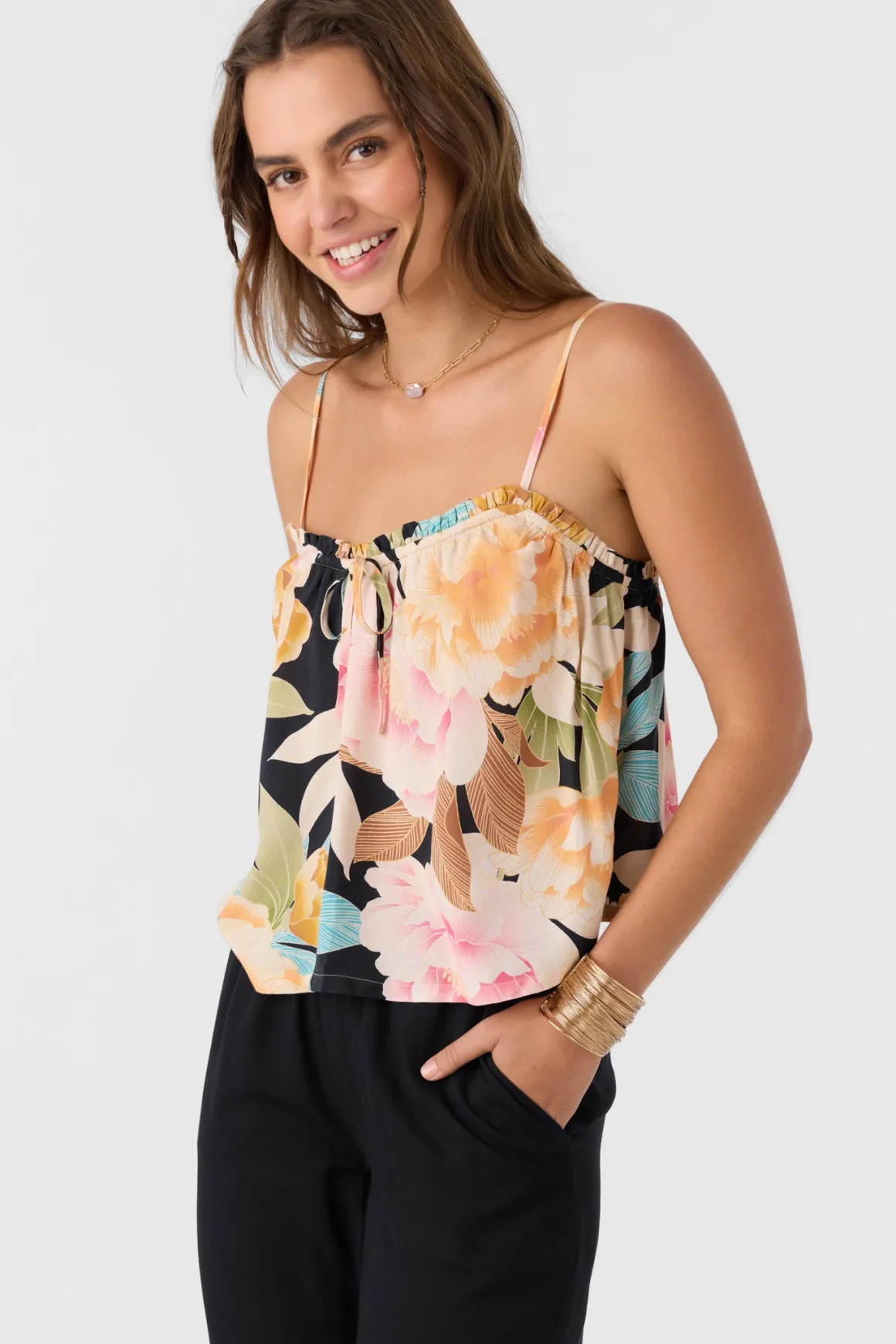 Ready for sunshine woven tank top that has a skimmer length fit, ruffle detail at top opening and allover print.