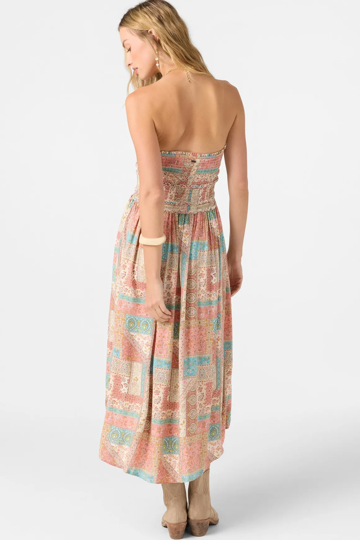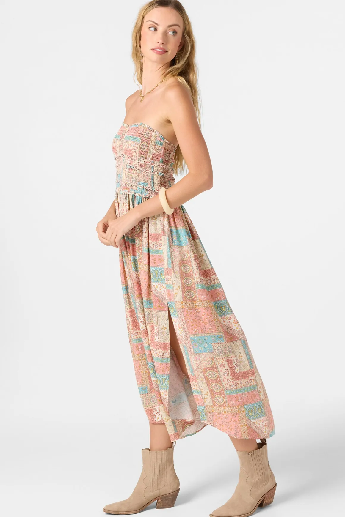 Feminine and flowy strapless midi dress that features a ruffle hem design, left side slit detail and allover print.