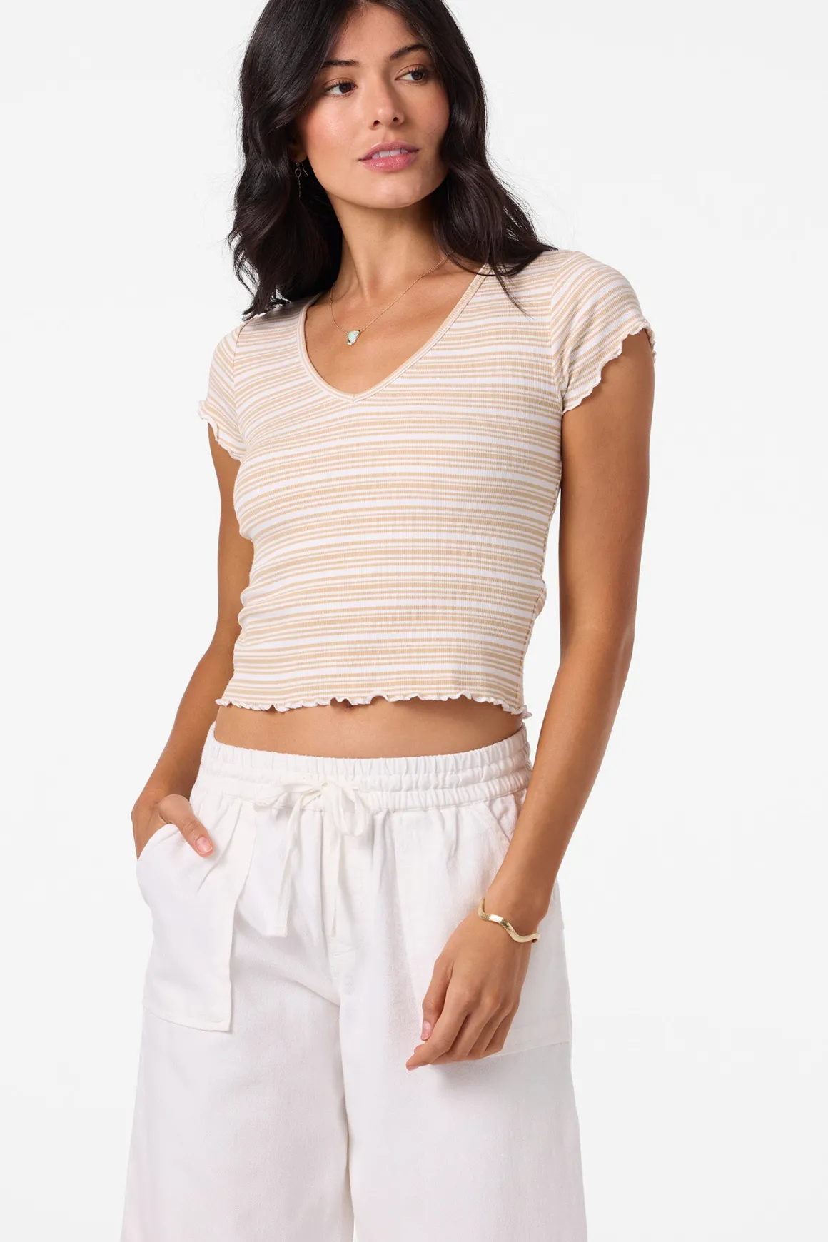 Essential rib knit tee that has a classic yarn dye stripe design, skimmer length fit, v-neckline and lettuce hem detail.