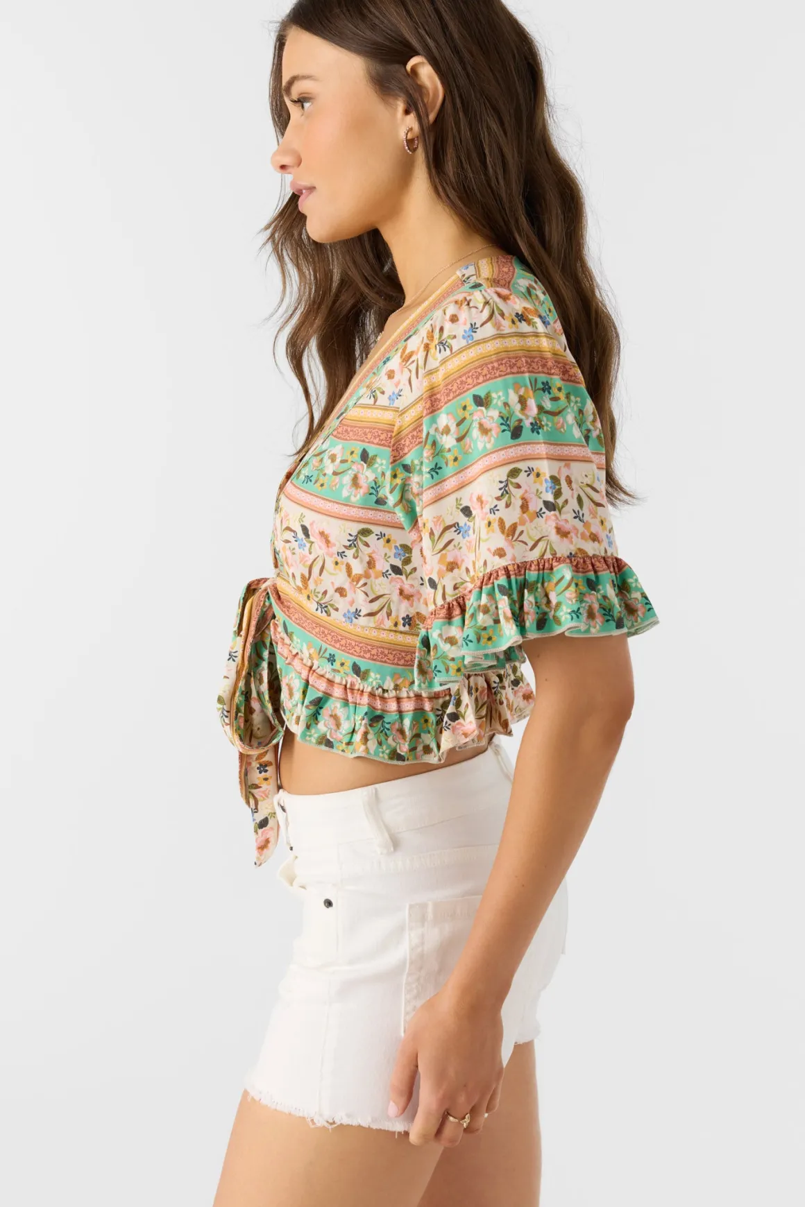 So sweet woven top that has a breezy, relaxed fit and deep v-neckline with self-tie.
