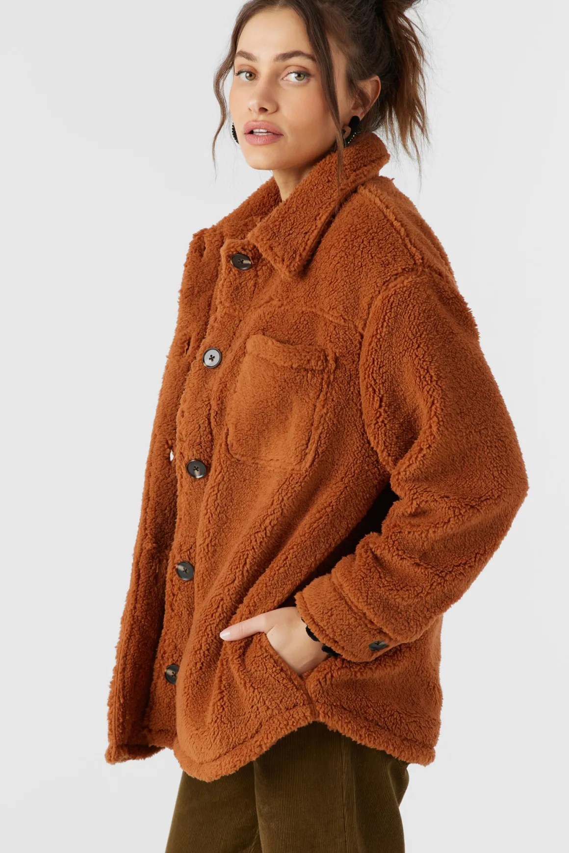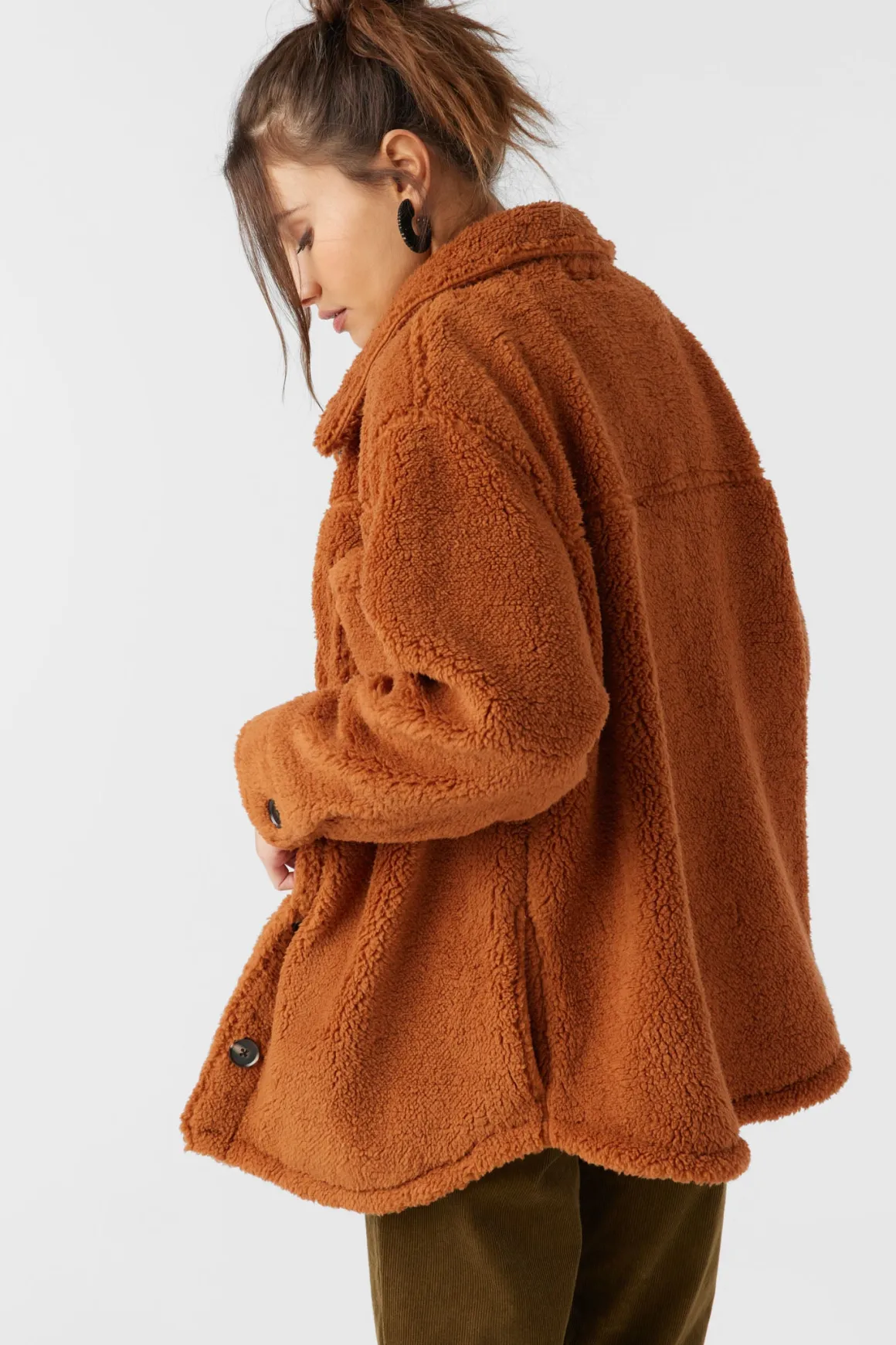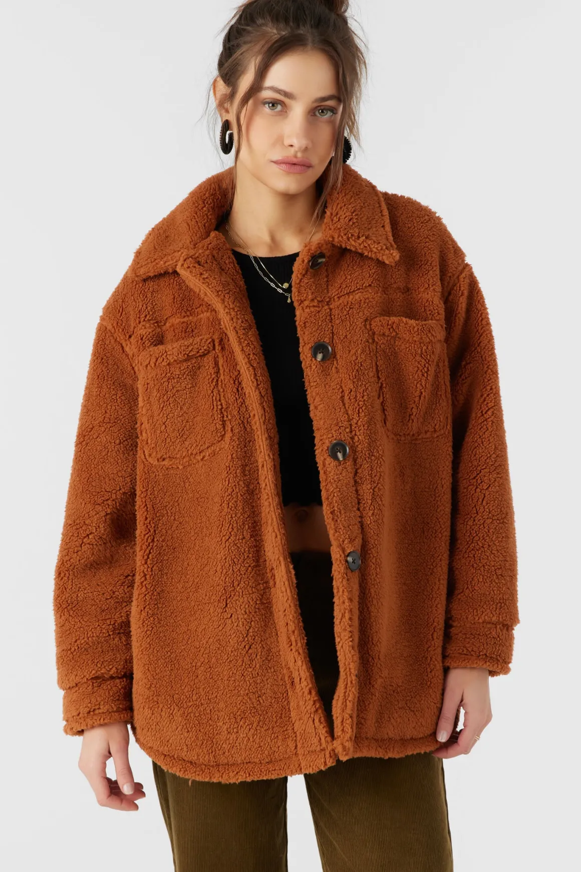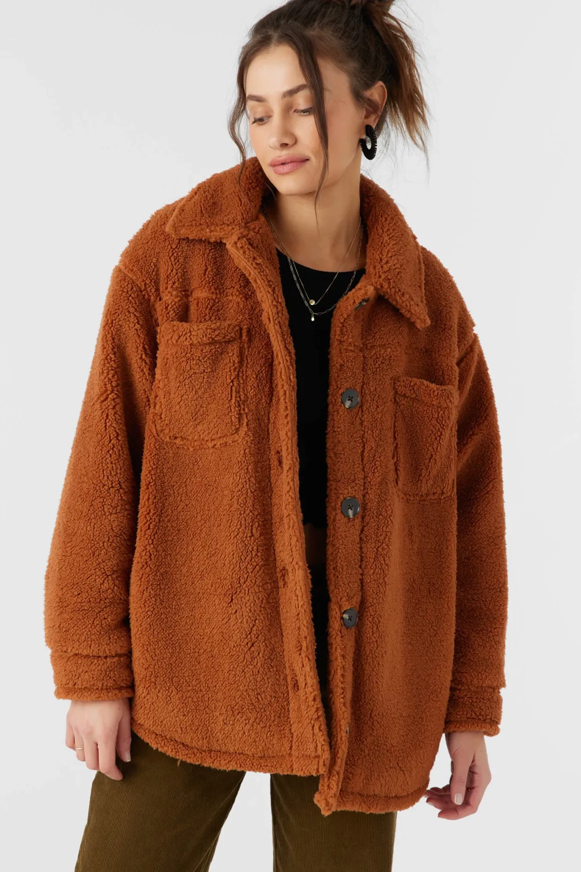 The perfect anytime jacket, ready to wear on cool seaside mornings or late nights out. It’s made with a cozy sherpa material, has a front button closure and relaxed oversized fit.