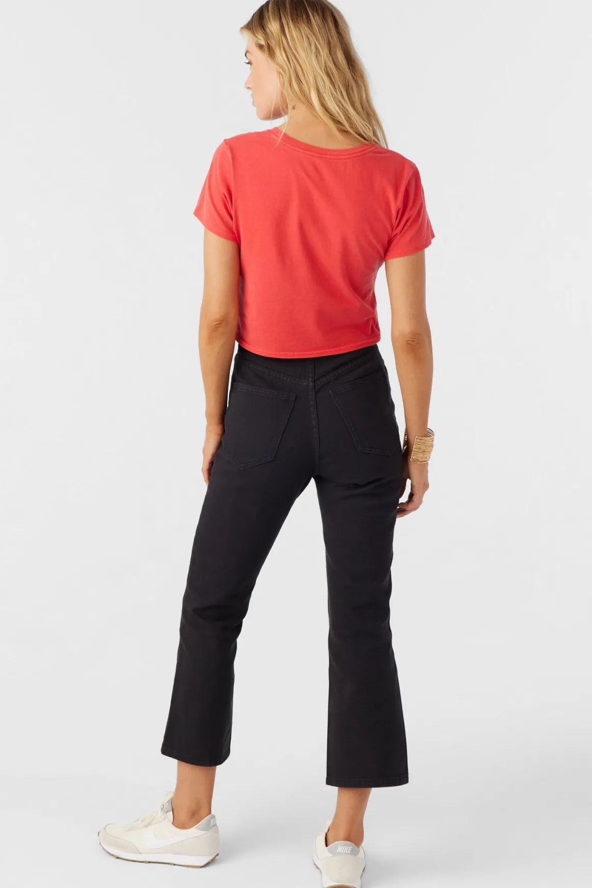 Essential denim pant that features a classic 5-pocket design, crop length fit and solid color wash.
