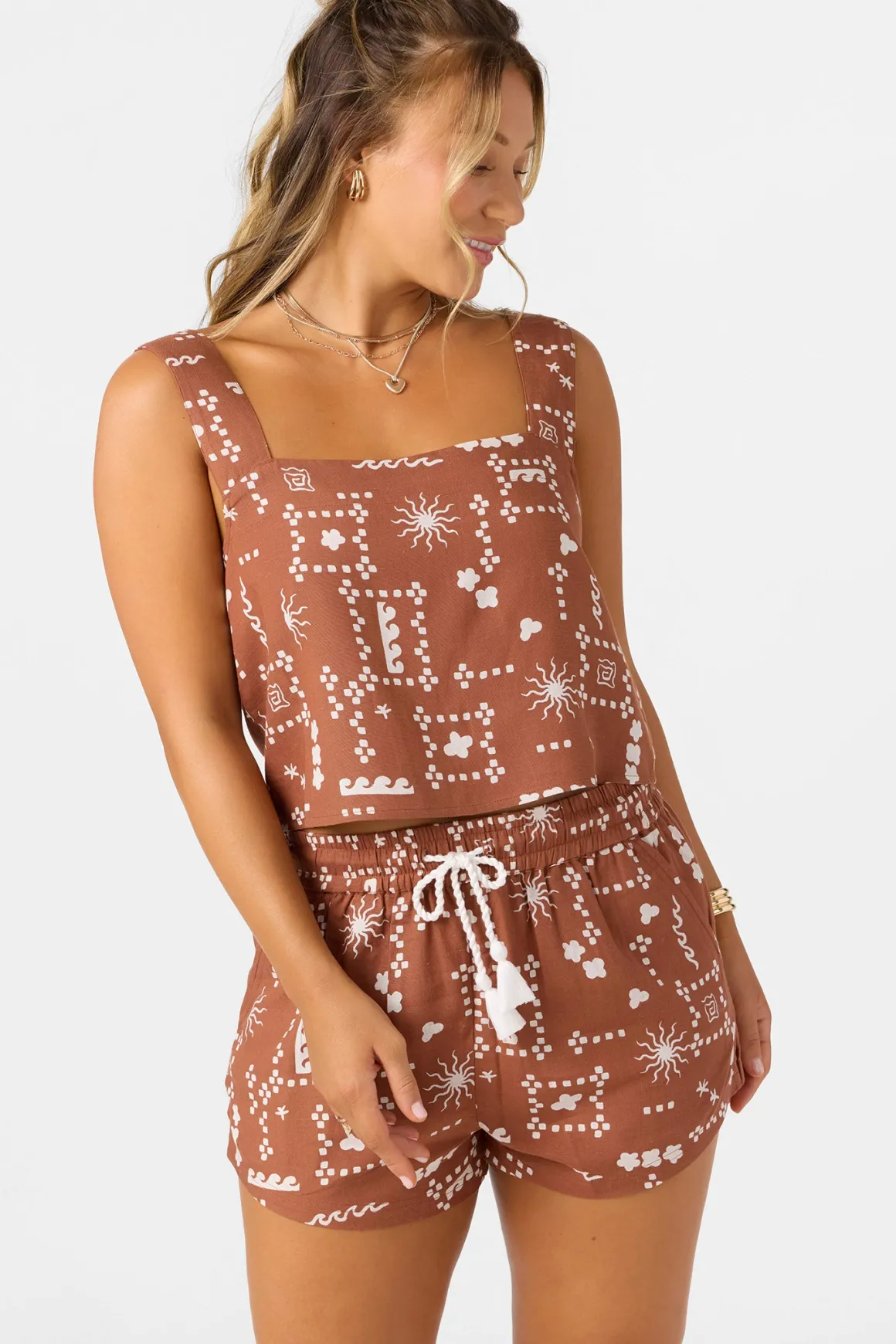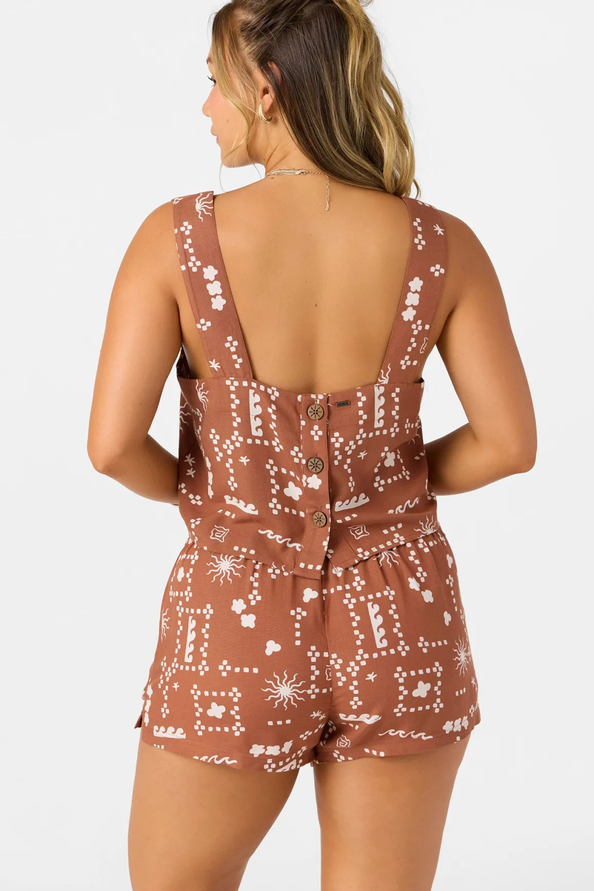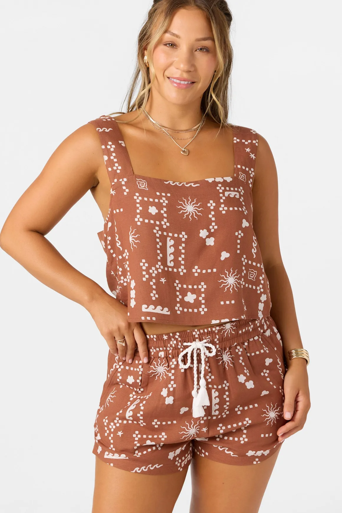 Ready for sunshine woven tank top that has a skimmer length fit, wide strap design and unique allover print.