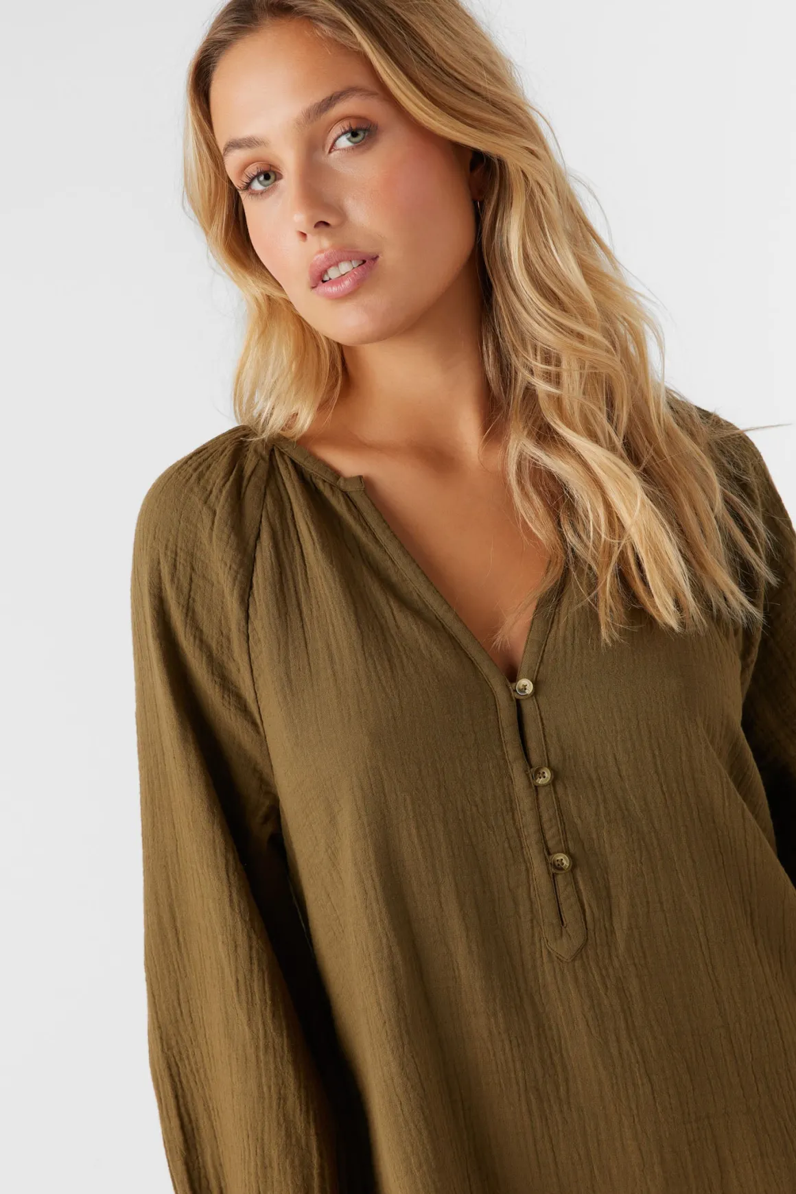 A flowy cover-up dress that has a relaxed long sleeve design and mini length fit.