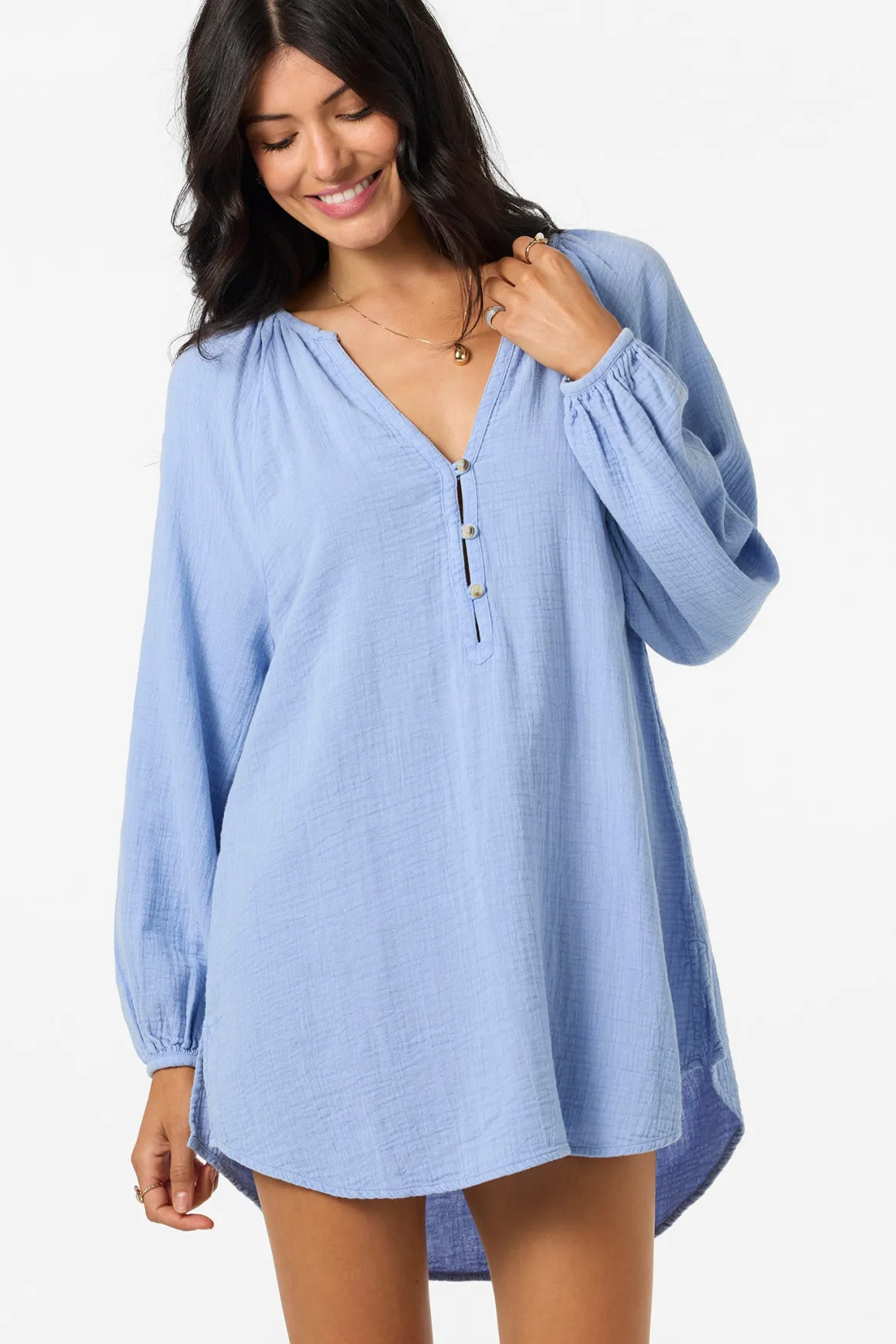 This flowy cover-up dress has a relaxed long sleeve design, mini length fit and deep v-neckline with button closure.