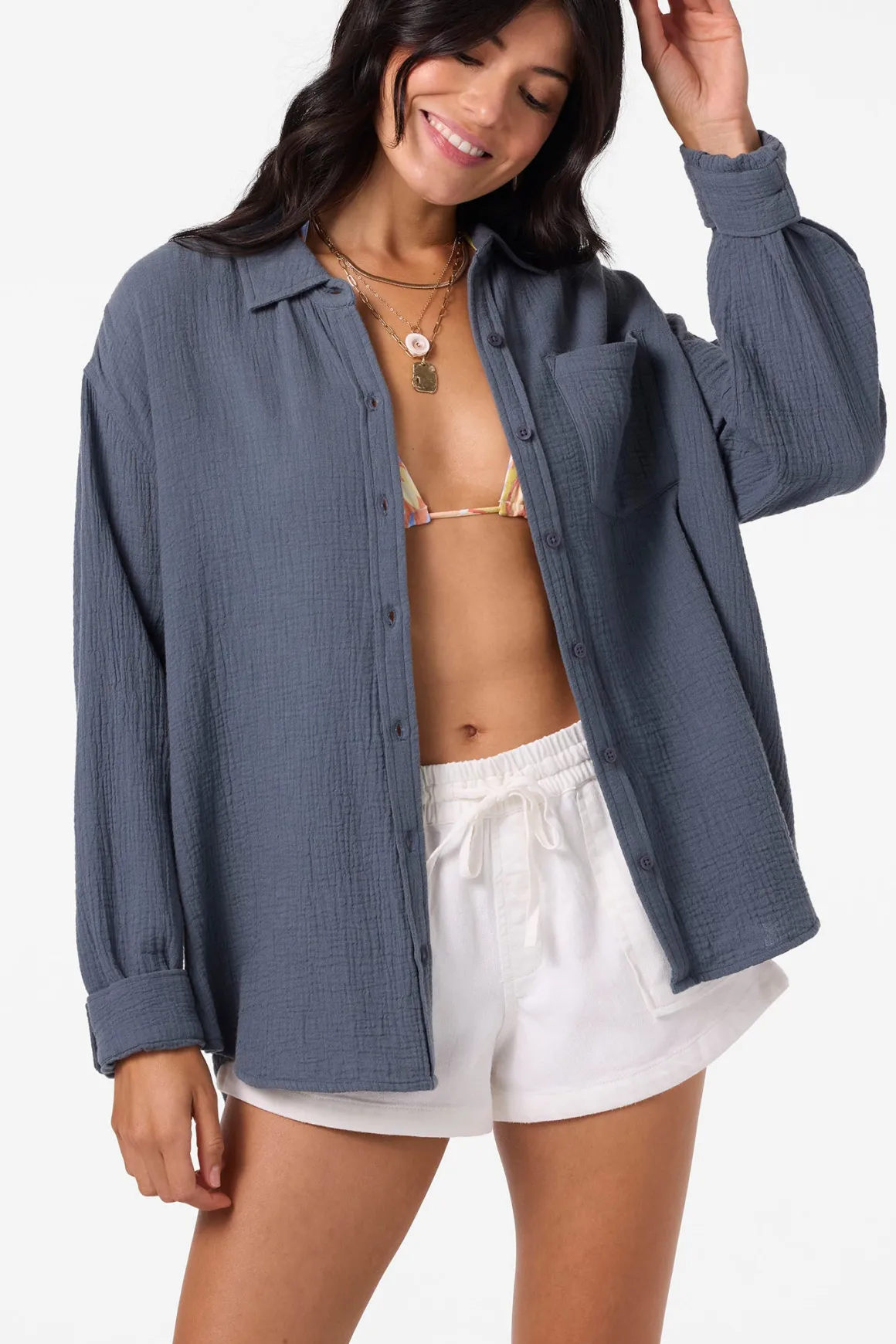 Effortlessly cool woven long sleeve top that has an oversized fit design, front button closure with collar and yarn dye solid wash.