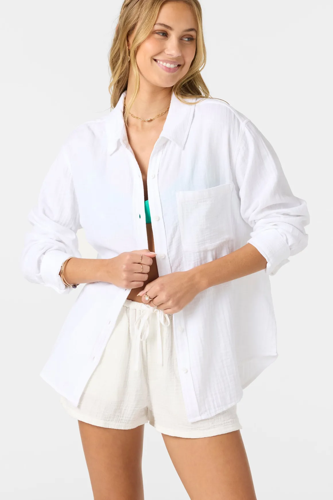 Effortlessly cool woven long sleeve top that has an oversized fit design, front button closure with collar and yarn dye solid wash.