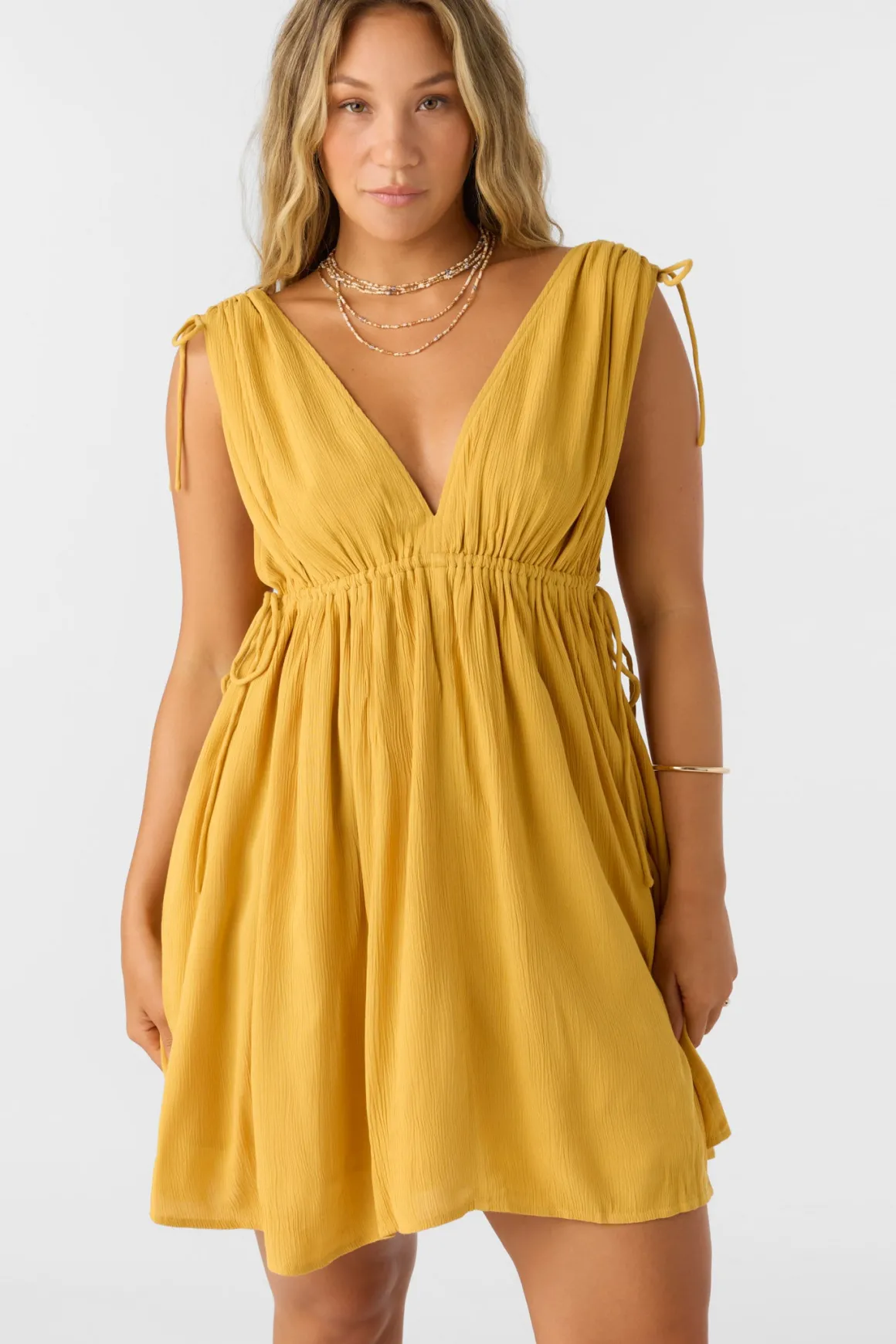 Embrace laid-back elegance in our versatile mini dress, featuring adjustable drawstrings and a flattering v-neck, crafted from soft crinkled viscose for a look that’s both effortless and chic.