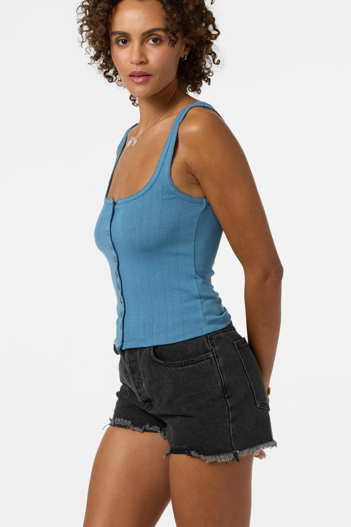 Ready for sunny days ahead. This lightweight knit tank features a solid color design, button front and intricate fabric detail.