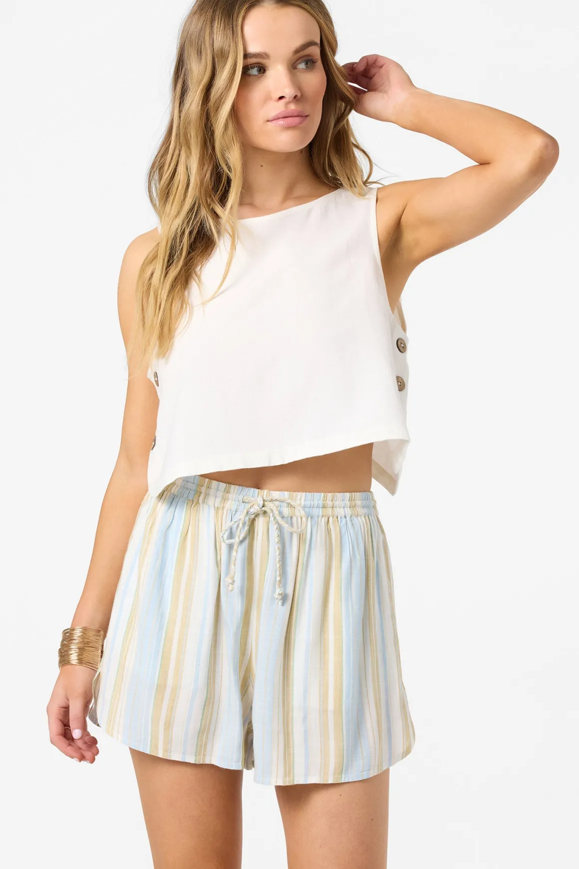 A light weight, flowly short with stripe detail fabric and an elastic tie waist.