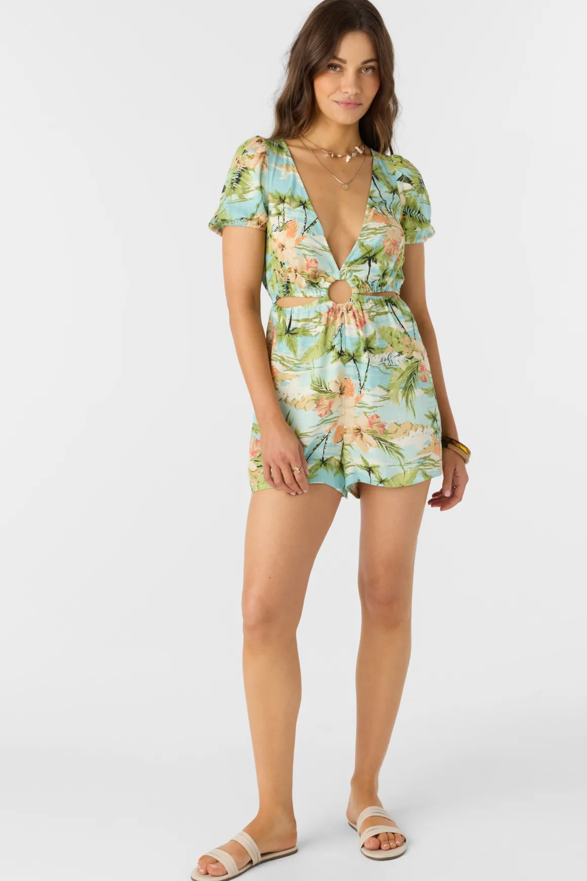 Step into warmer days with this head-turning romper that balances vintage charm and modern flair. The puff sleeves and deep V-neck create an alluring silhouette, while the elasticated cutouts and self-covered ring at the waist offer a playful design.