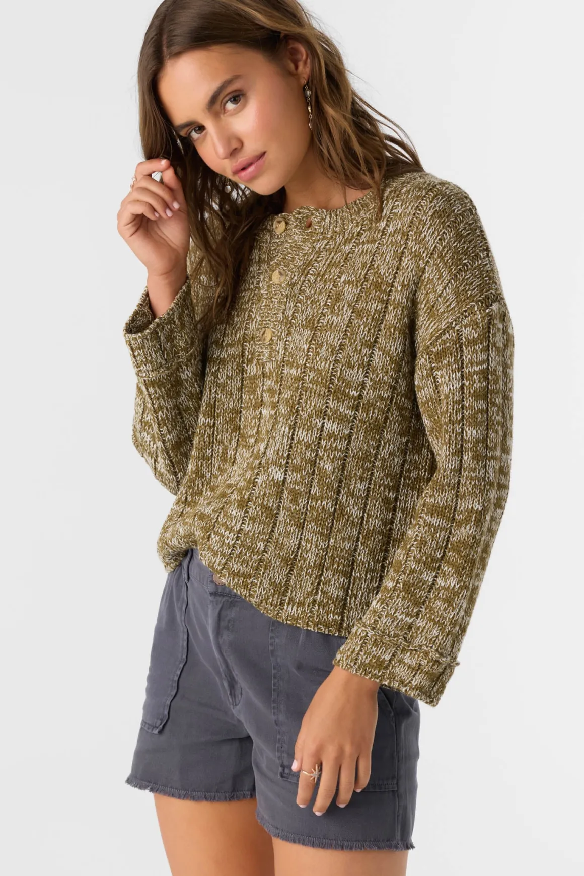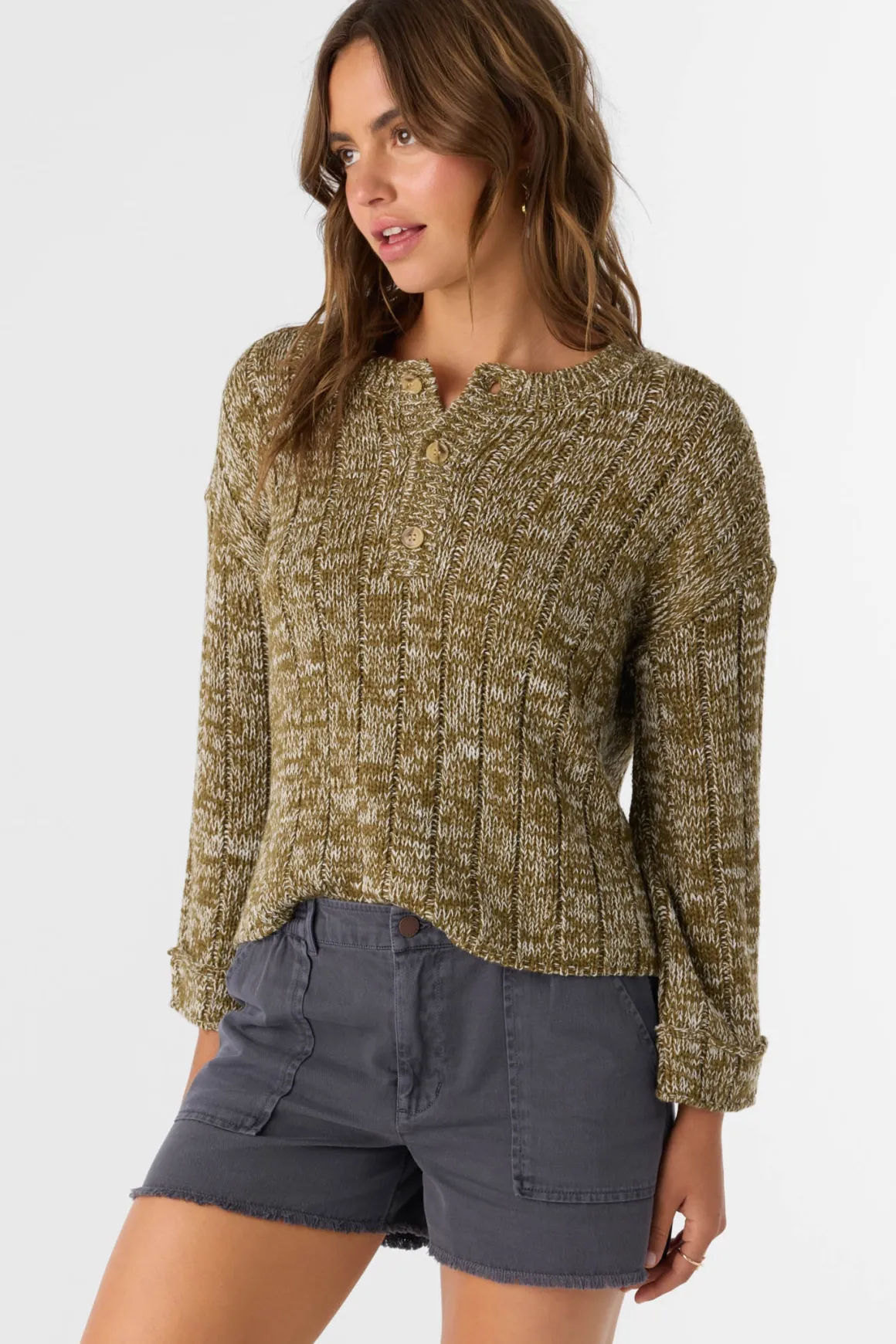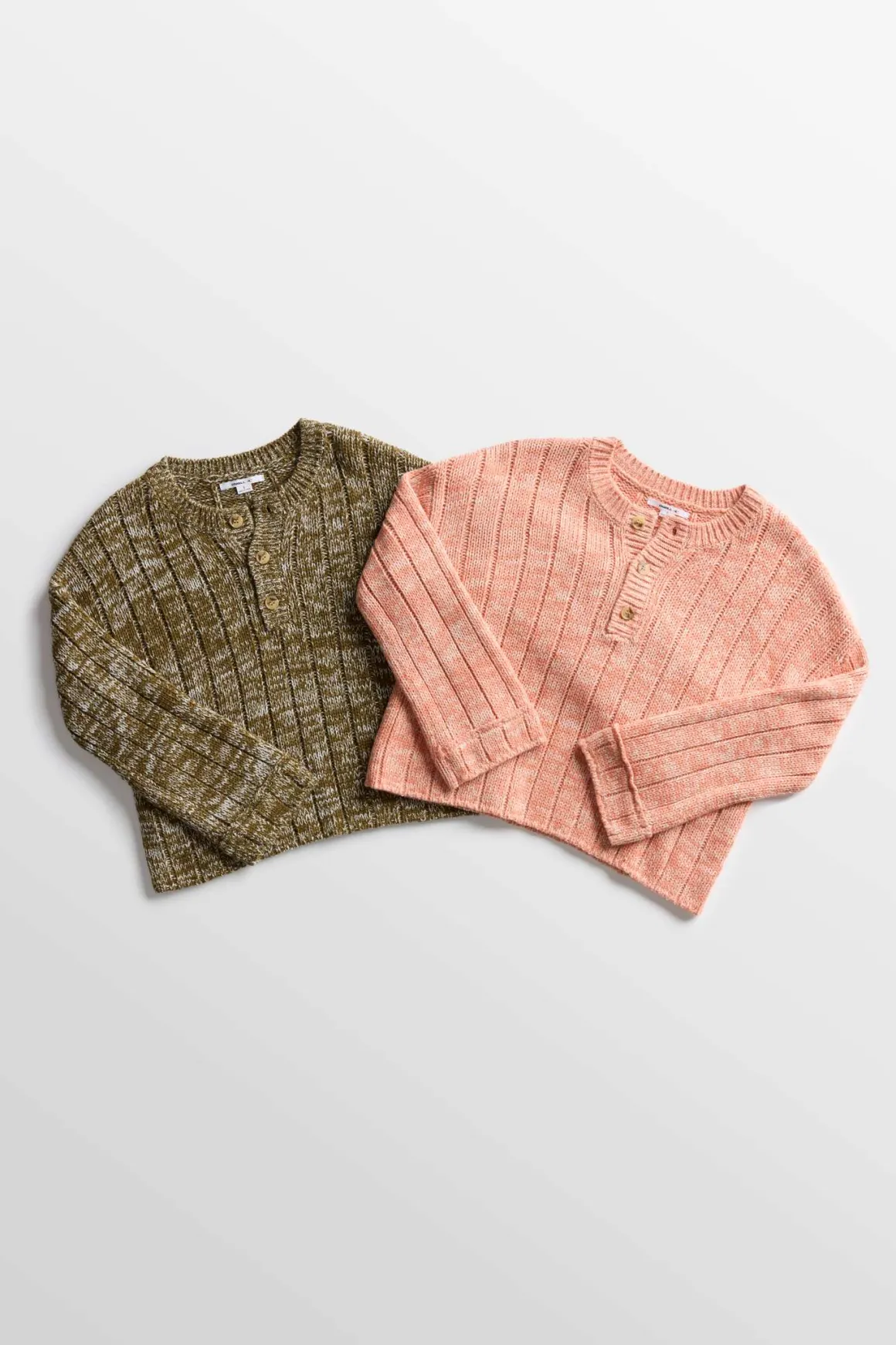 Essential henley knit sweater that has a skimmer length fit, quarter button design and drop shoulder detail.