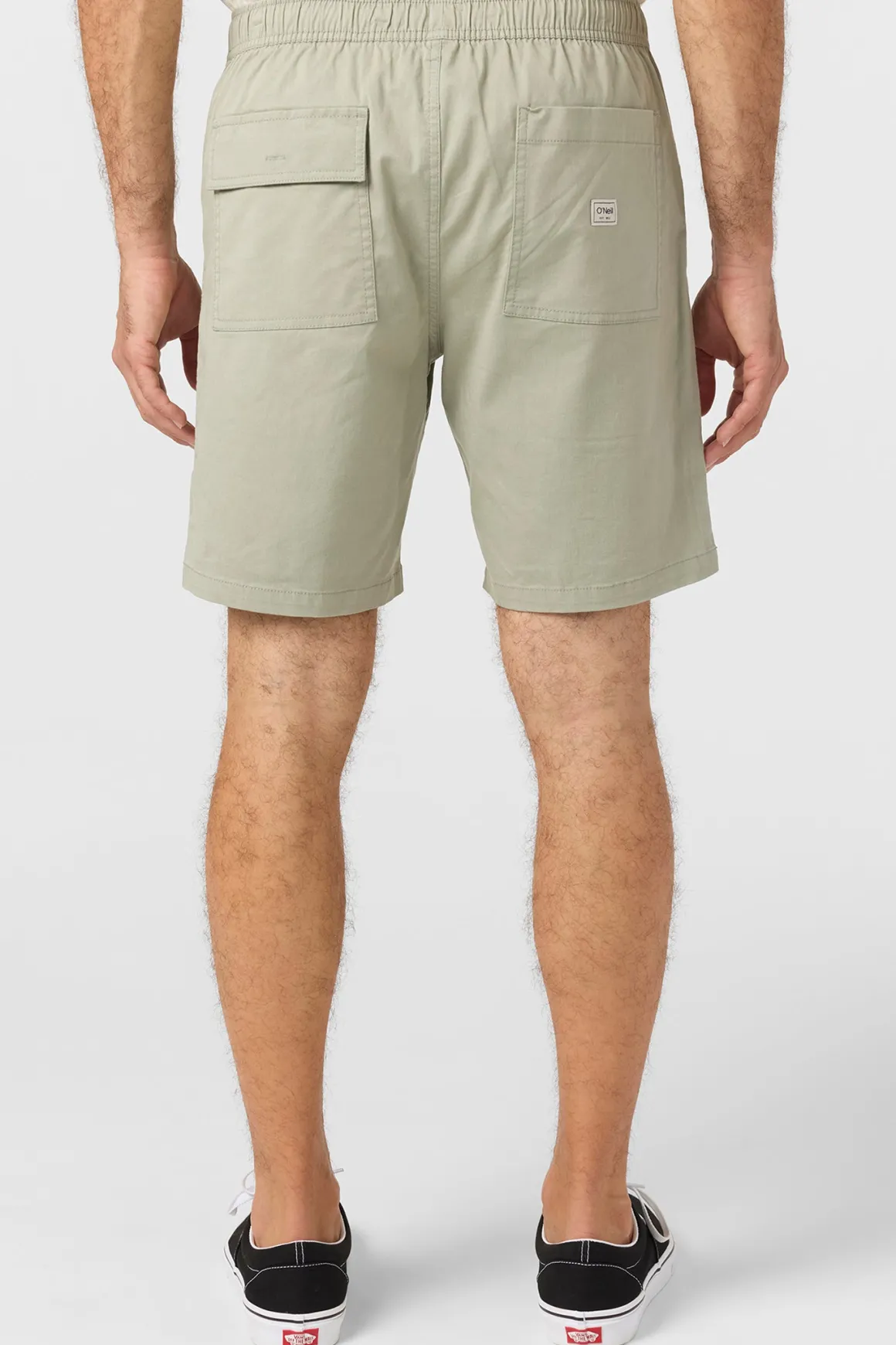 Relaxed and comfortable cotton stretch short that features a front patch pocket design, elastic waist with drawcord and vintage style circle surfer logo.