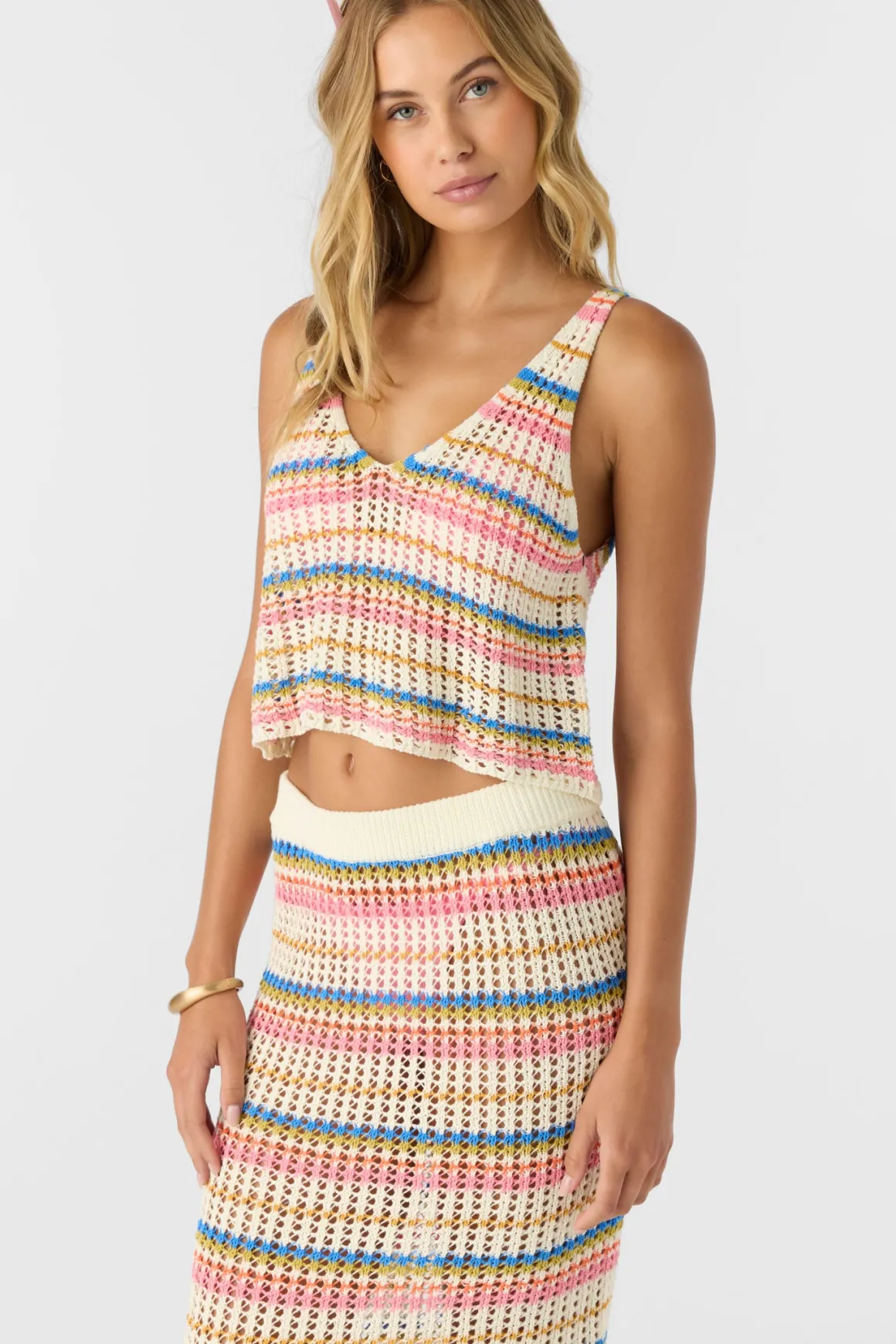 So cute knit cover-up tank top that features a crochet cotton design, v-neckline and skimmer length fit.