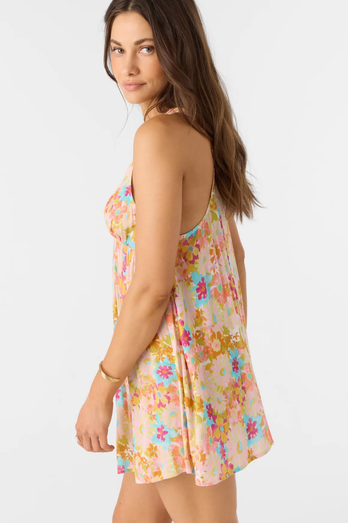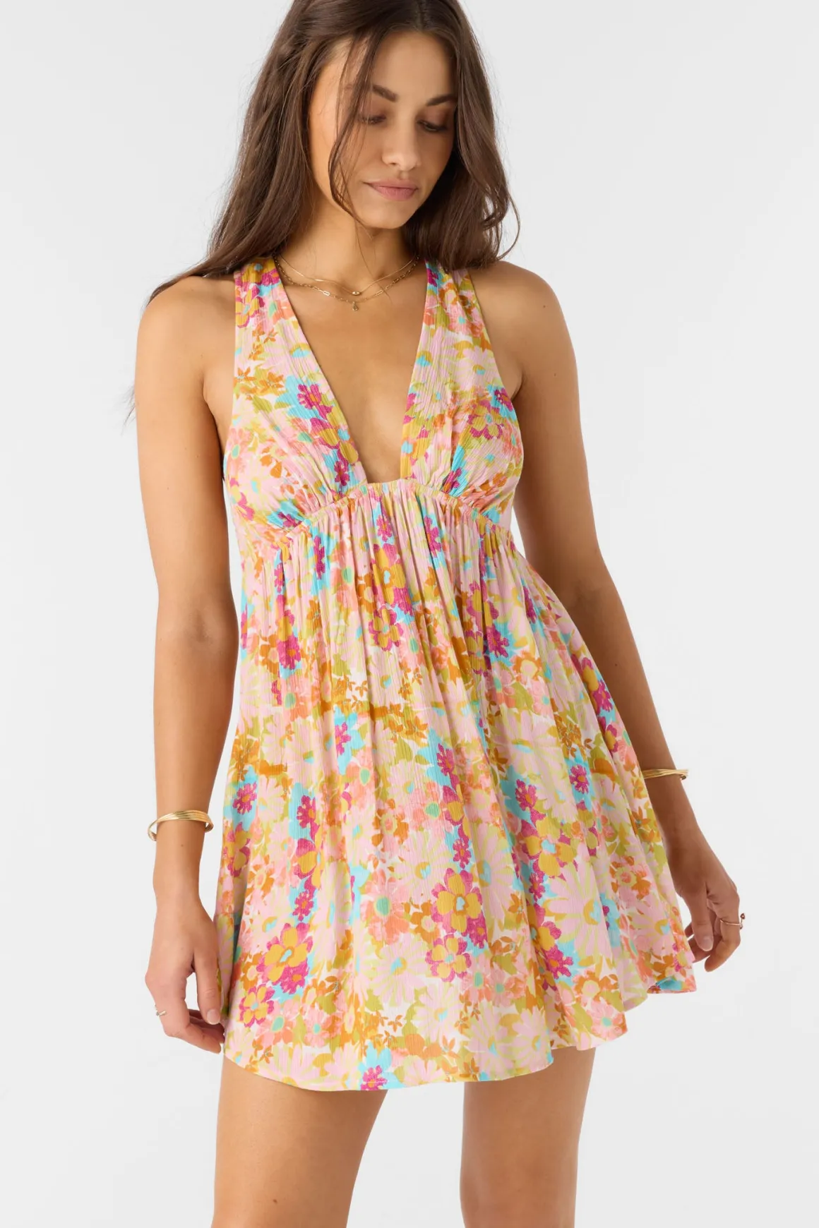 Cute and flowy cover-up dress to elevate your beach look. It features an allover print design and deep v-neckline.