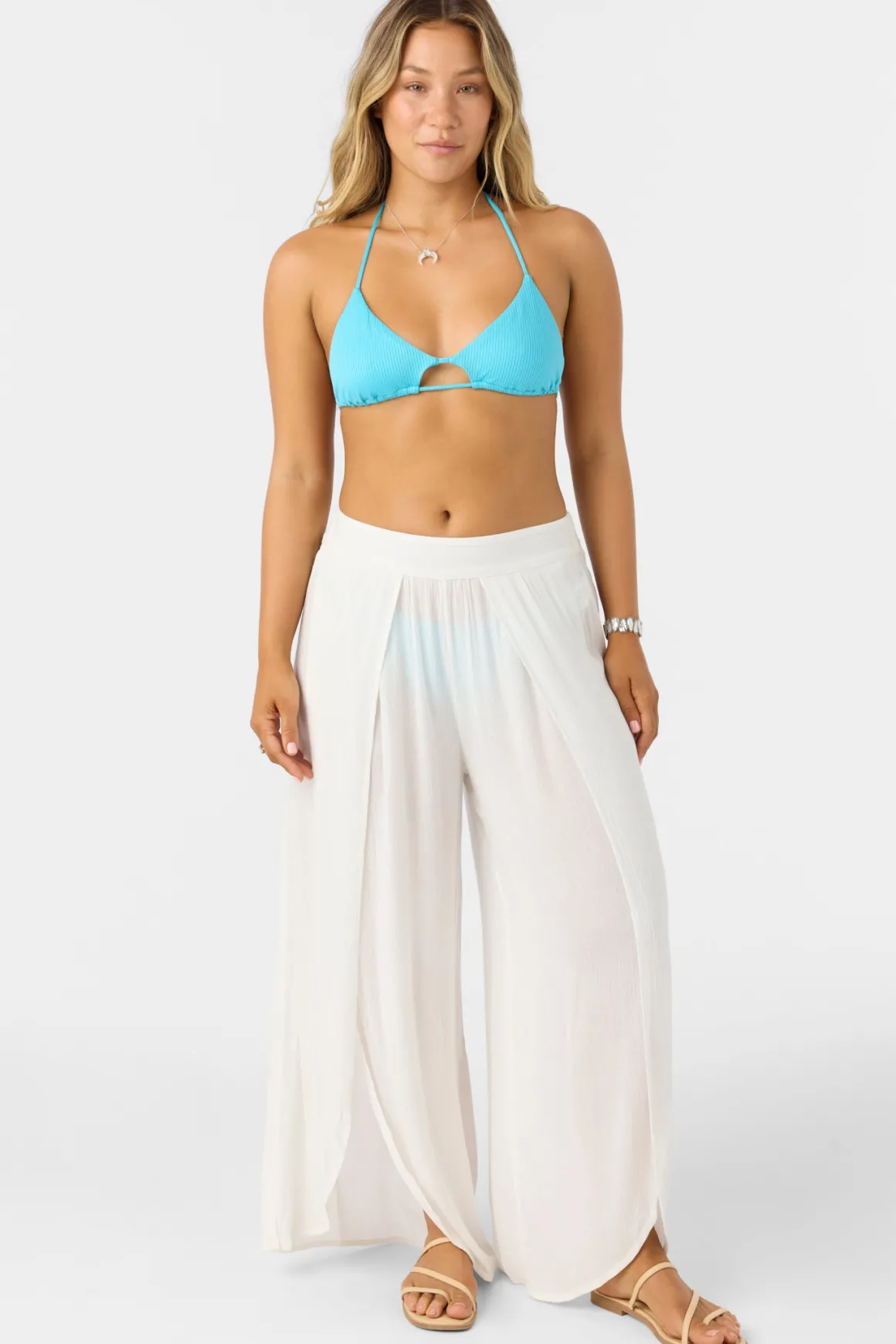 Laid-back, flowy woven pant that radiates effortless style. It features an elastic waist, wider fit and split leg detail.