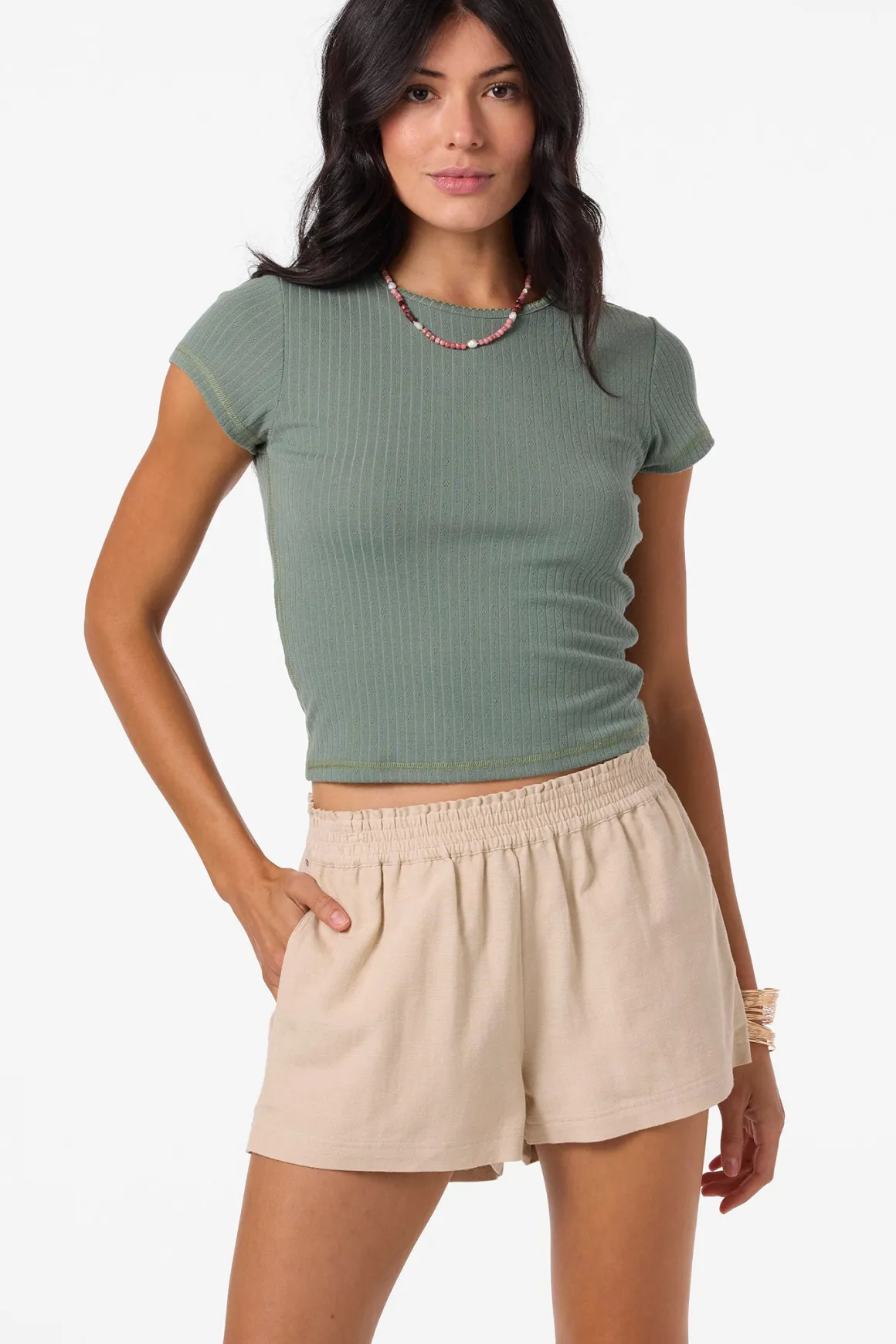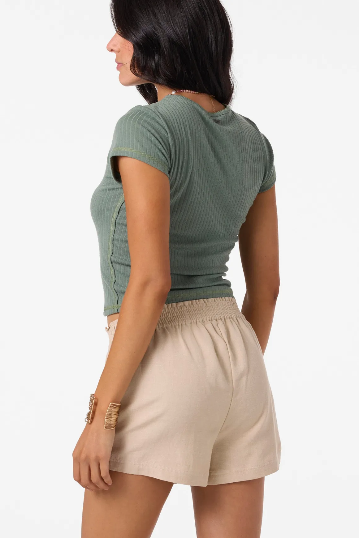 Essential woven short that has a relaxed flowy fit, solid color wash and paper bag style waist detail