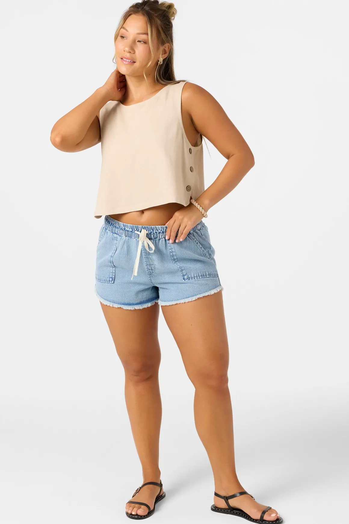 Ready for sunshine woven tank top that features a skimmer length fit, functional side seam buttons and cross over back detail.