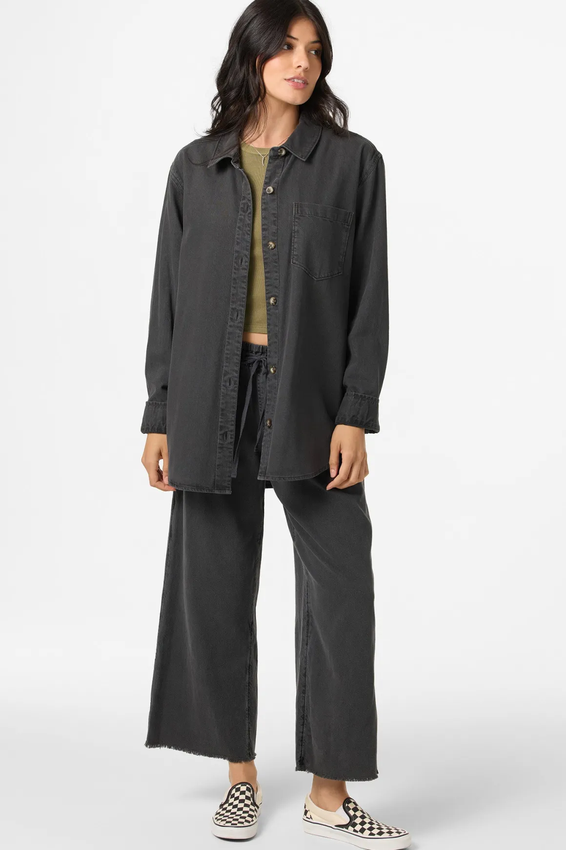 Perfect for layering over your favorite tee or tank, this heavier long sleeve top features a front button design with collar, solid color wash and comfy oversized fit.
