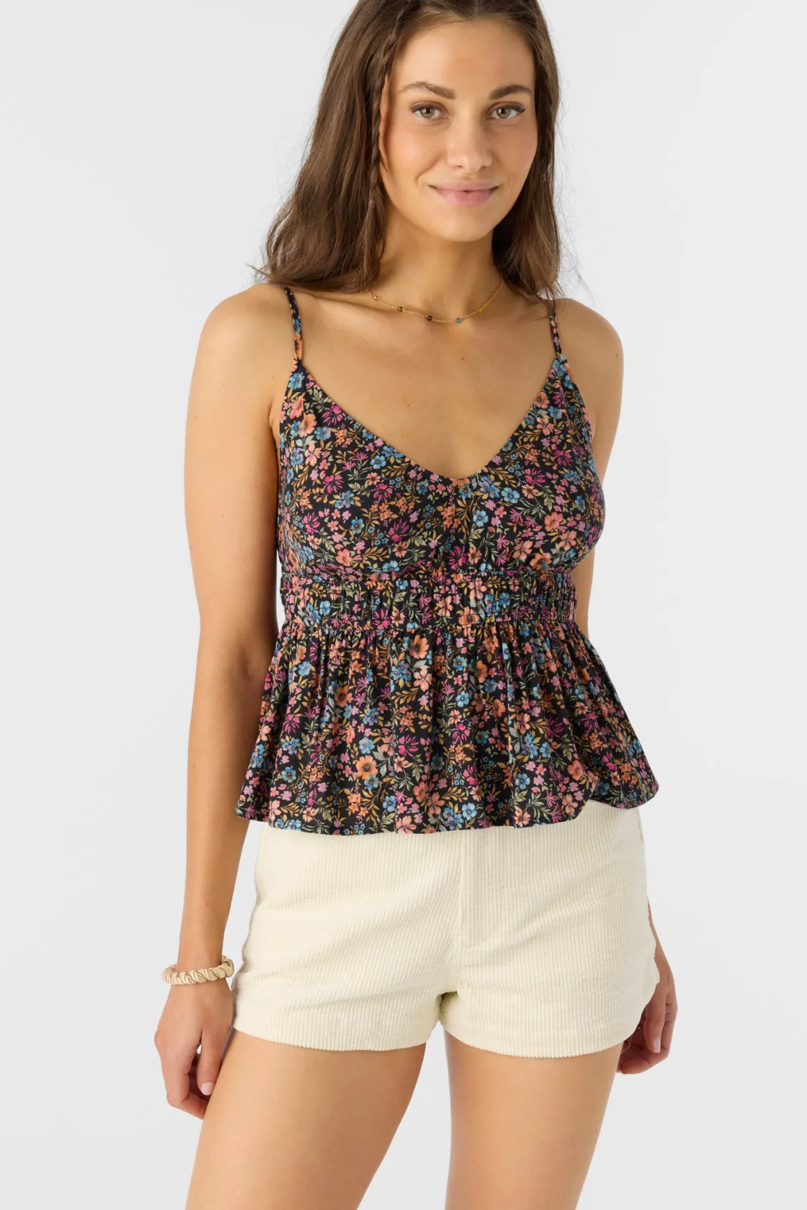 Easy breezy woven tank top that has a colorful print design, empire seam detail and regular length fit.
