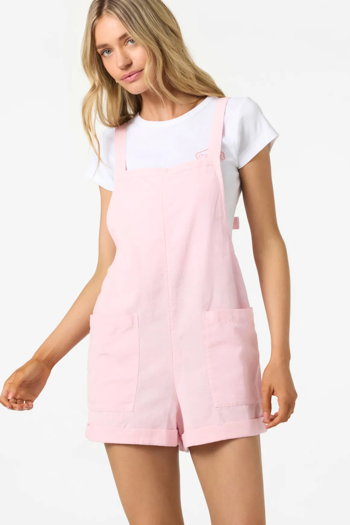 Easy and stylish overall romper that has a light cotton blend design, front patch pockets and adjustable straps.