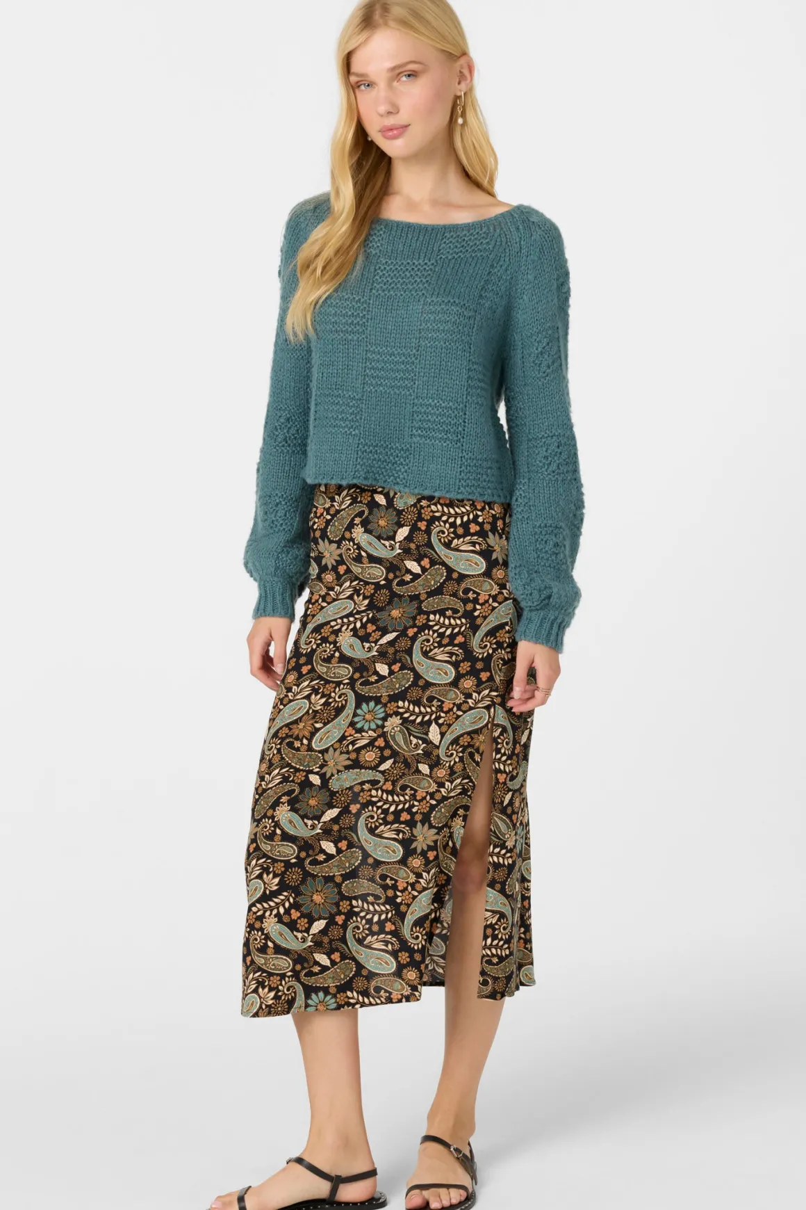 So stylish woven midi skirt that has a lightweight fabric feel, flowy fit, allover print and side slit detail.