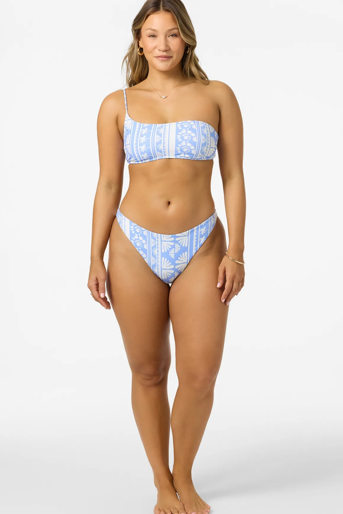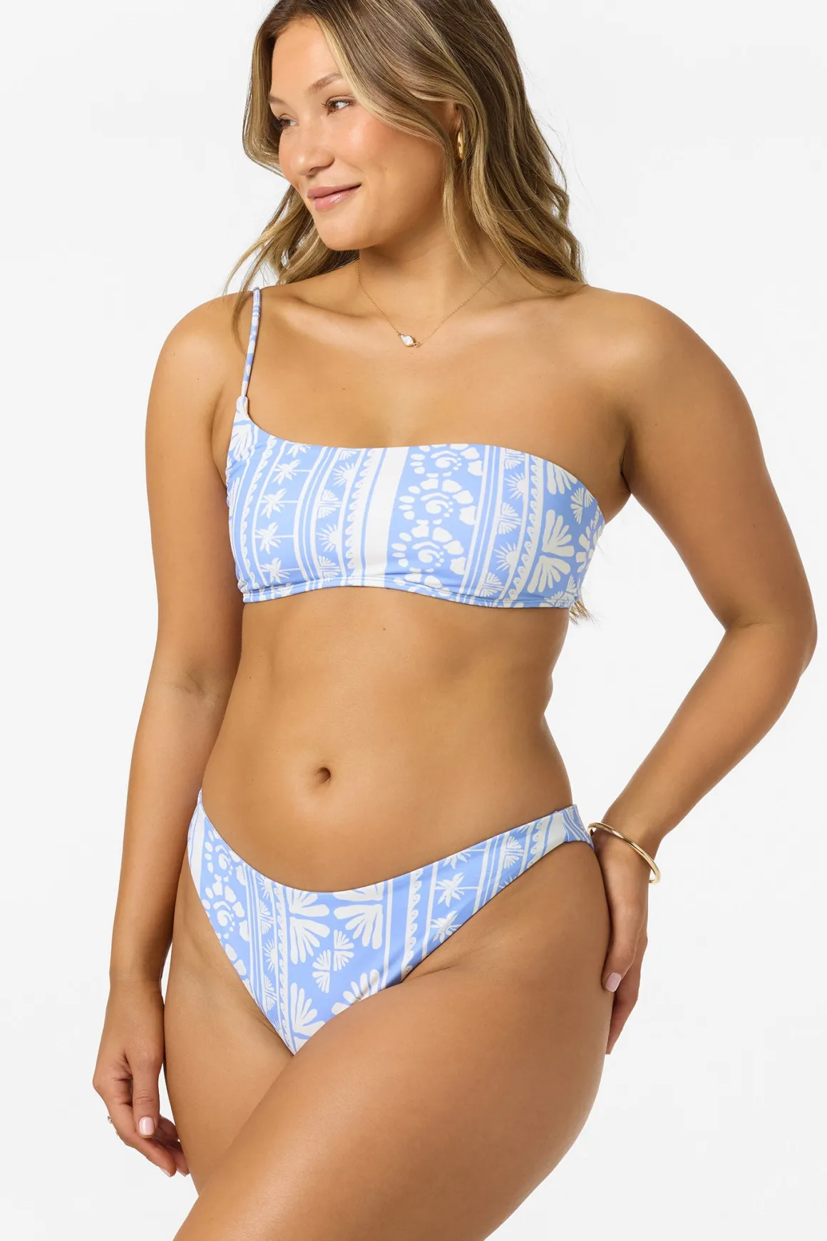 Unique one-shoulder bikini top with all-over-print and adjustable strap.