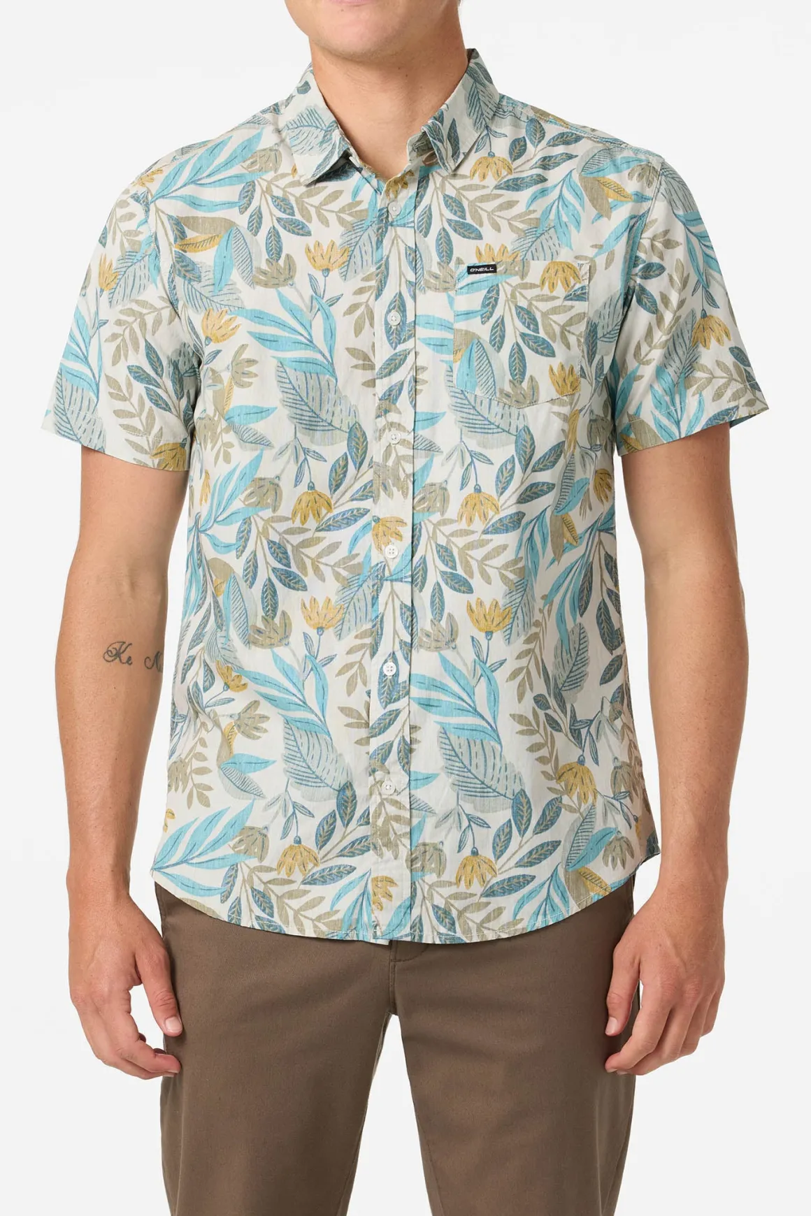 For sunshine and good times ahead. This essential button-up shirt has a front button closure, single chest pocket and allover print.