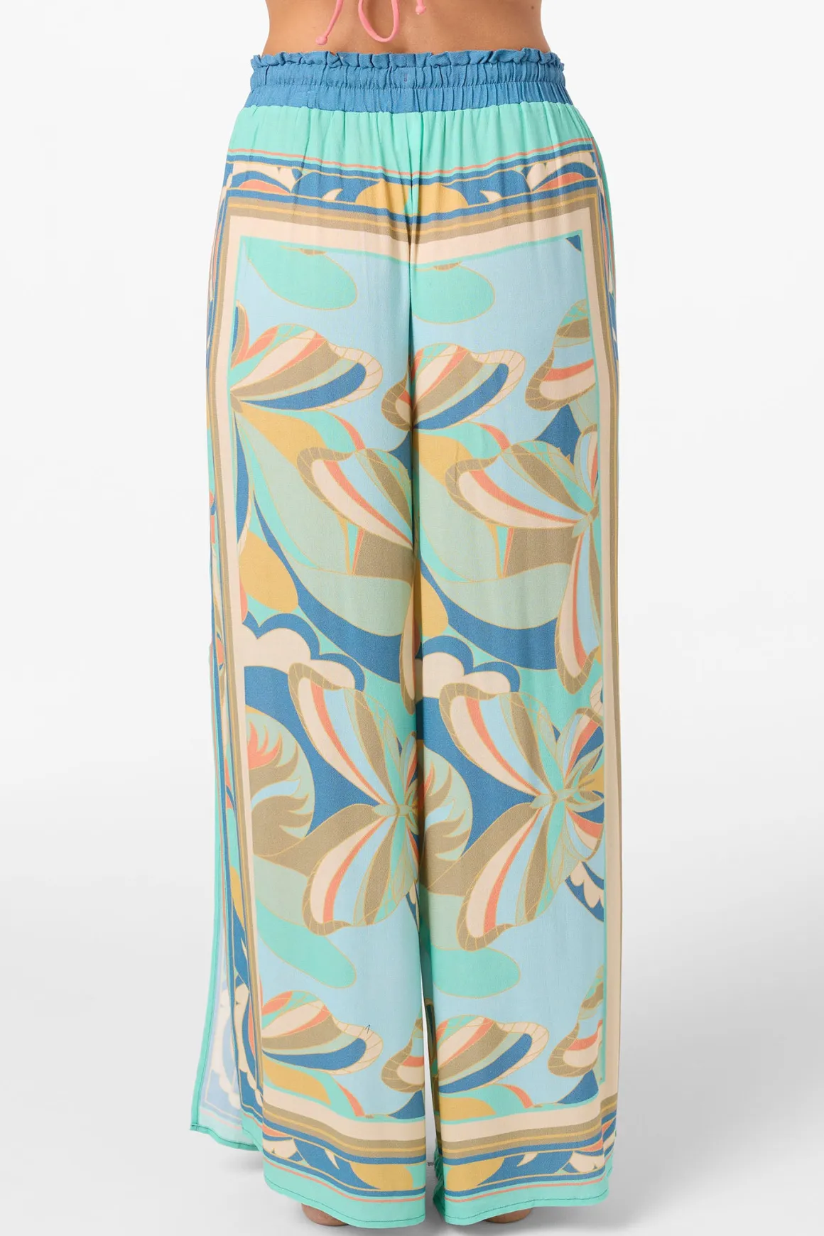 Laid back, flowy pants with wide legs, a tie front and colorful print.