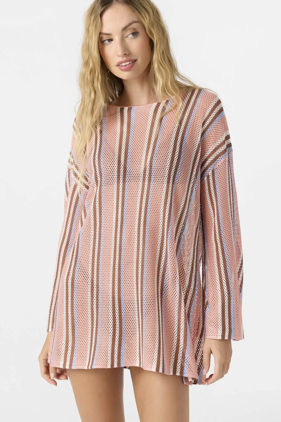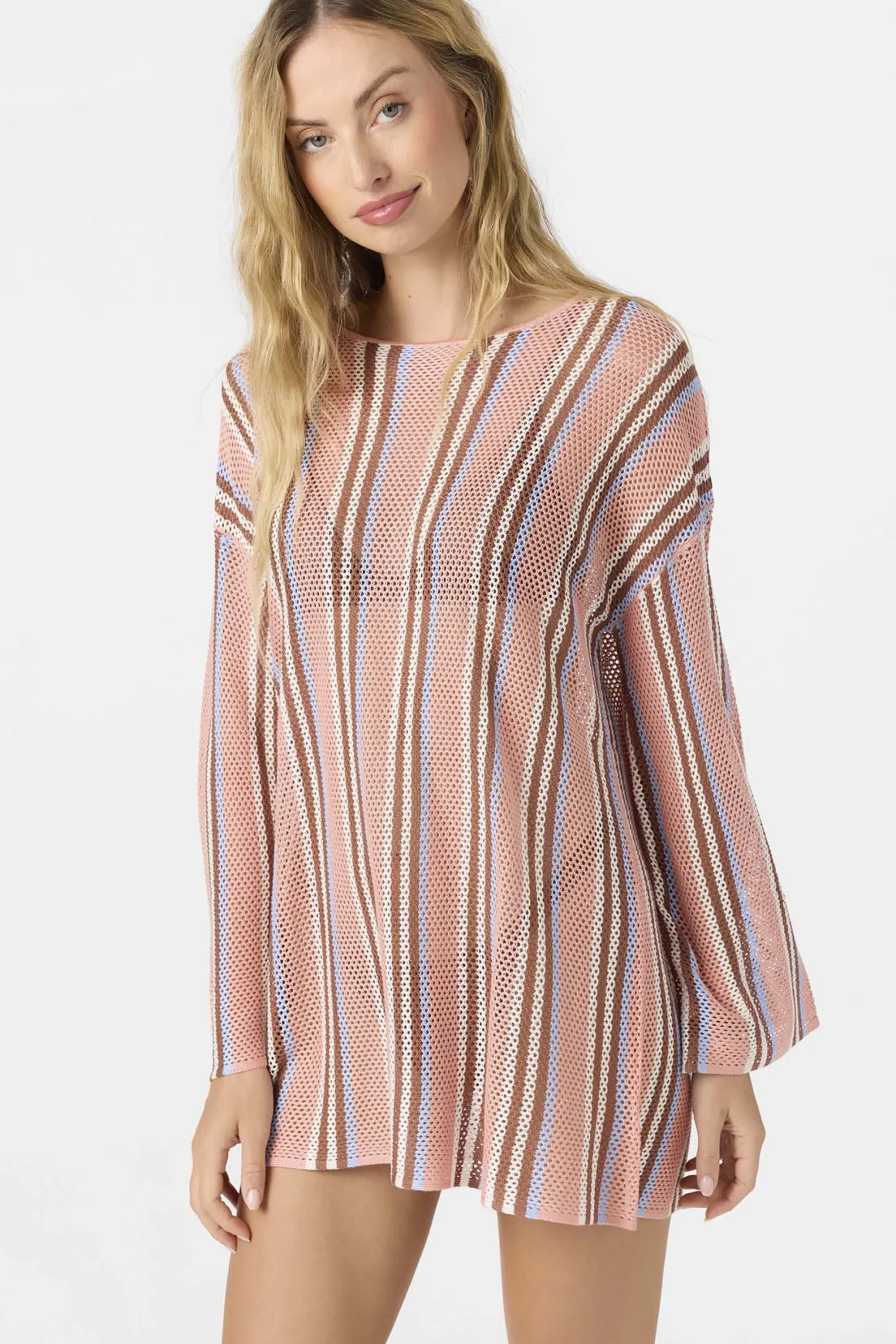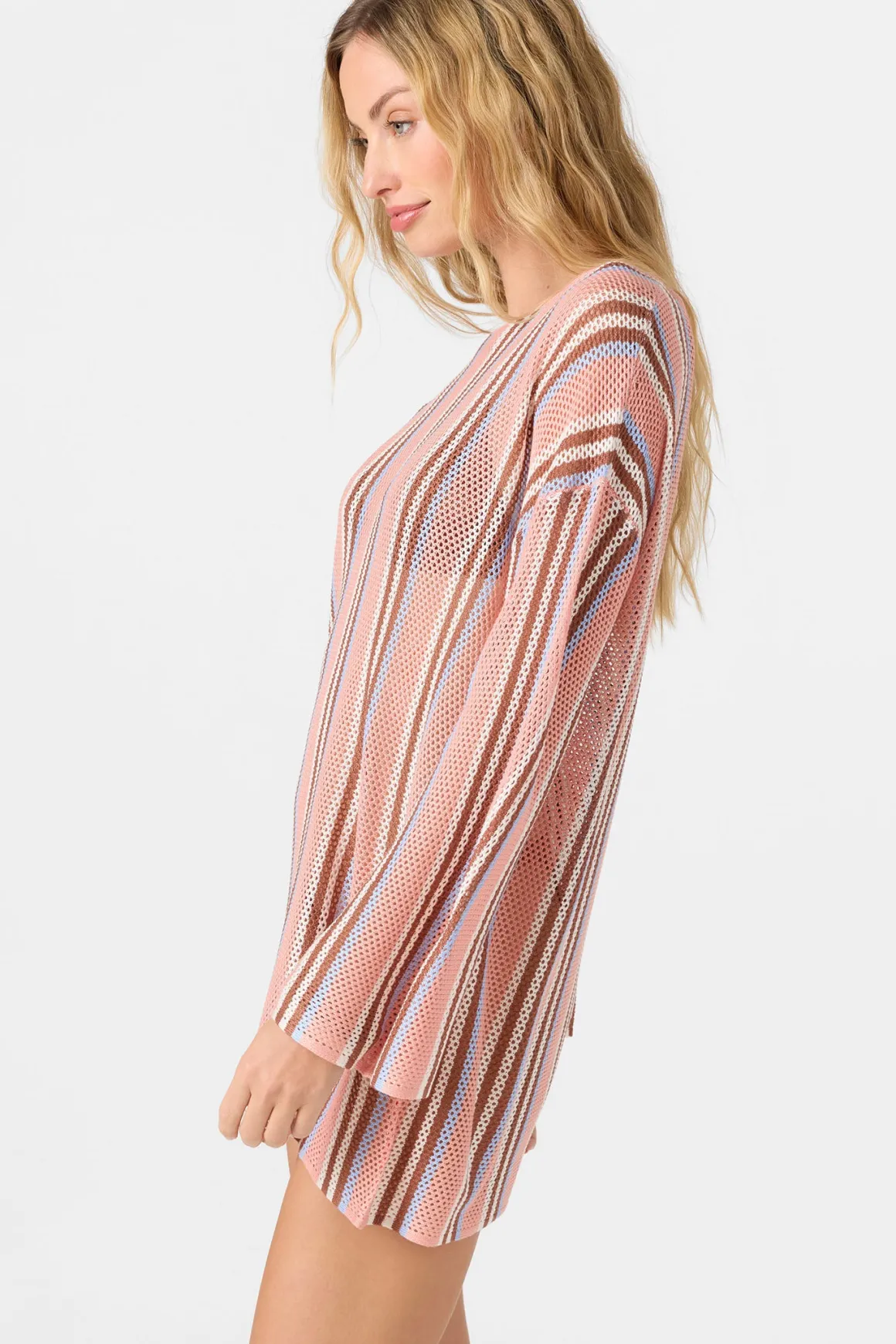 Drift effortlessly from beachside bliss to sunset soirées in this breezy and unique beach dress. It features a striped crochet design and flowy fit.