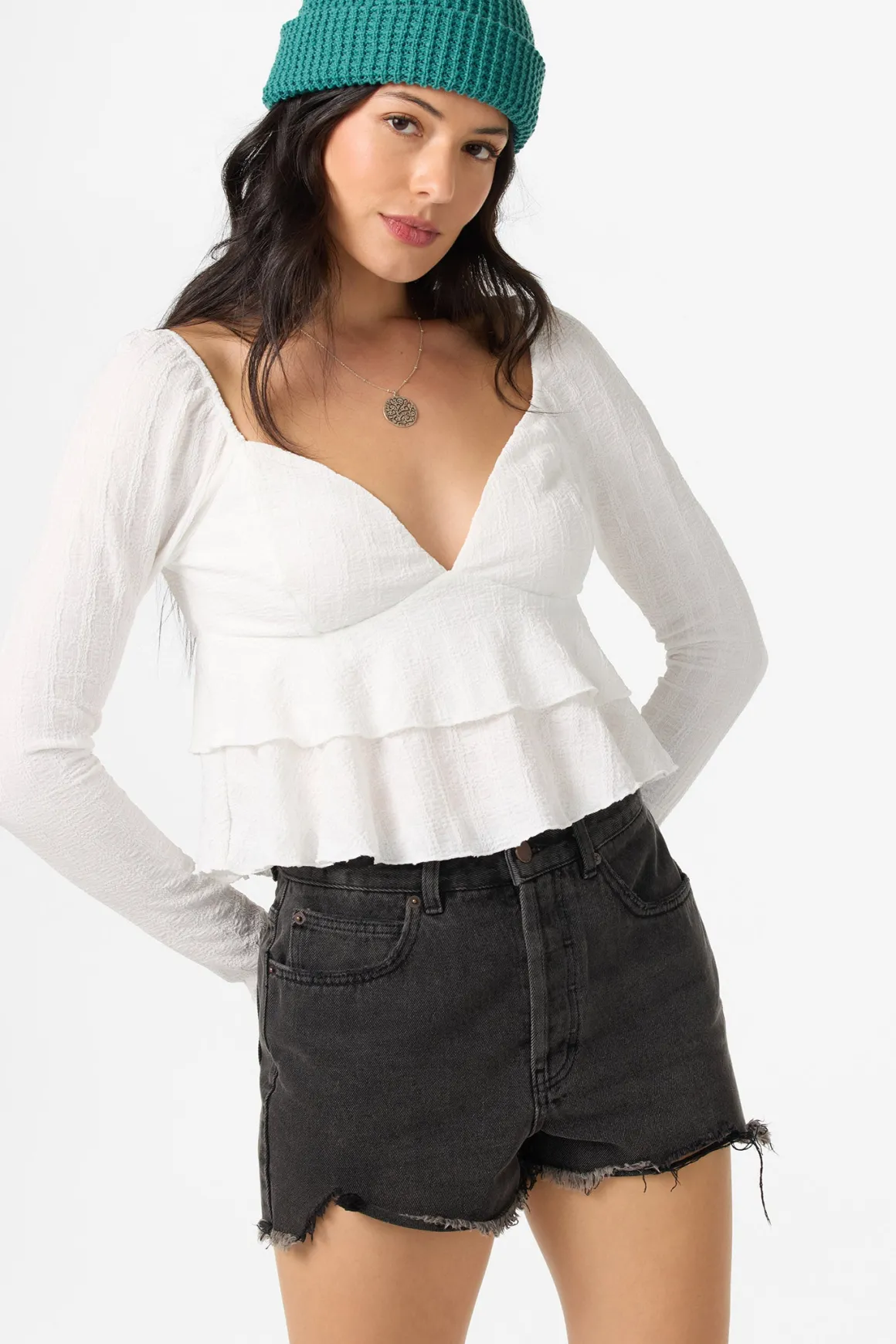 Soft and sweet, this flowy knit top features dreamy details like a tiered peplum and smocked back, perfect for chasing sunsets and ocean breezes.