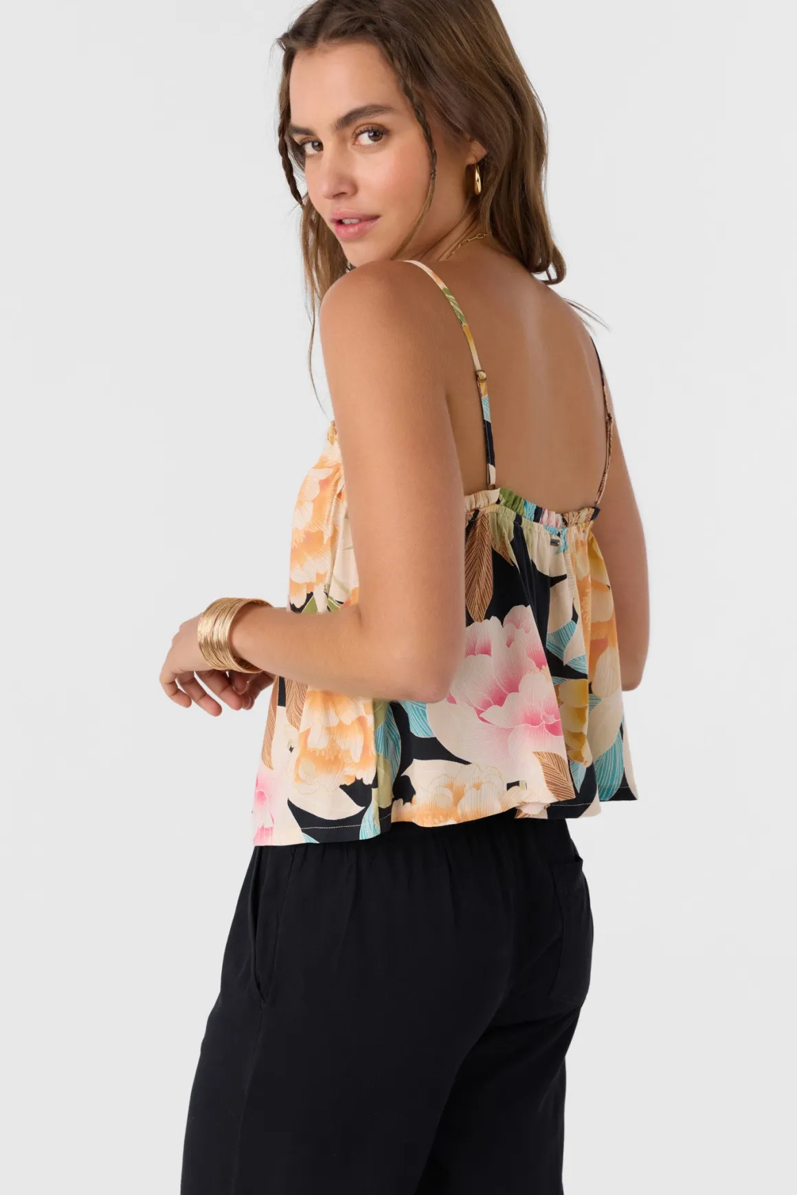 Ready for sunshine woven tank top that has a skimmer length fit, ruffle detail at top opening and allover print.
