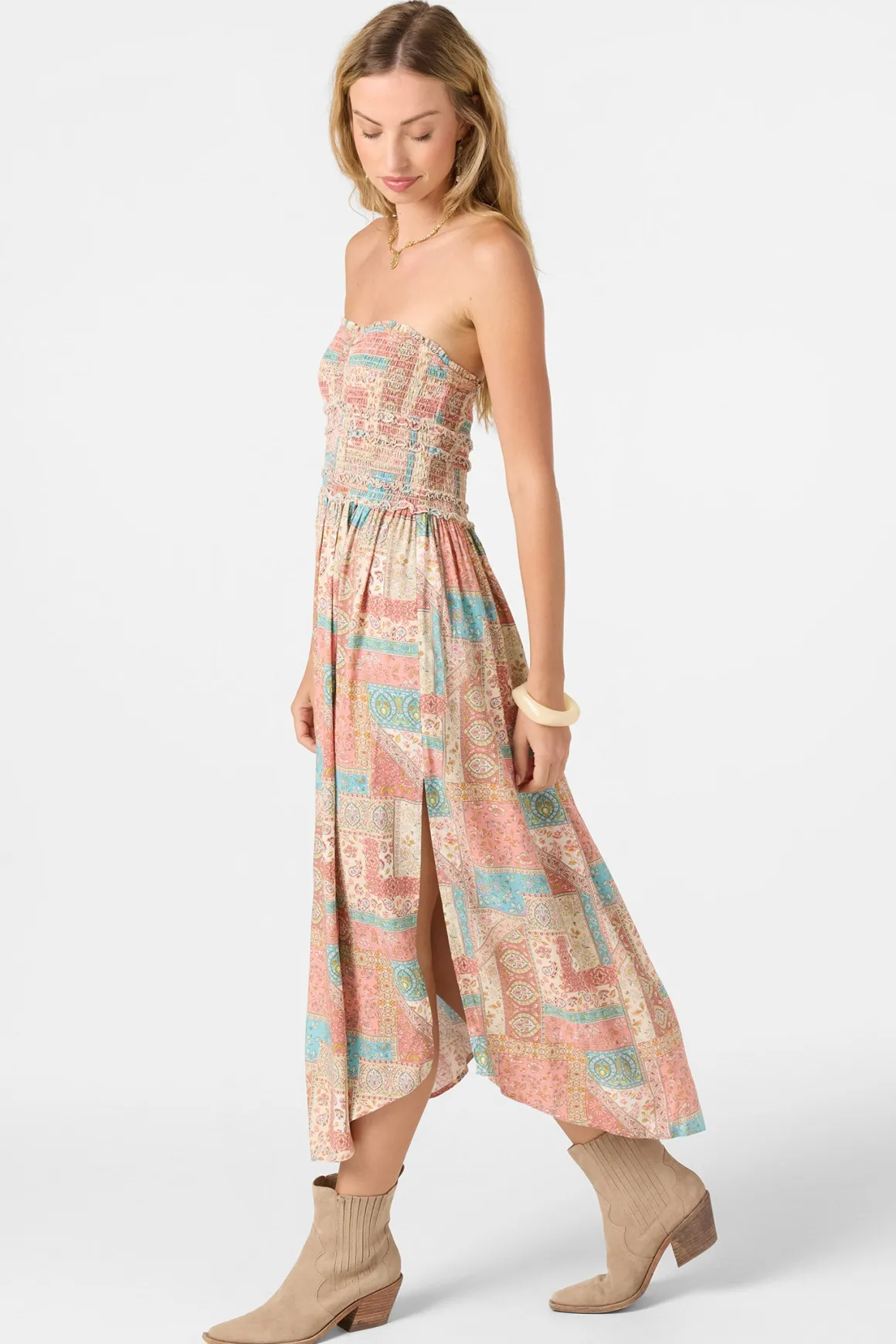 Feminine and flowy strapless midi dress that features a ruffle hem design, left side slit detail and allover print.