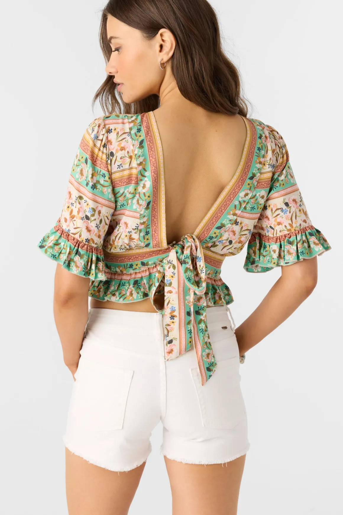 So sweet woven top that has a breezy, relaxed fit and deep v-neckline with self-tie.