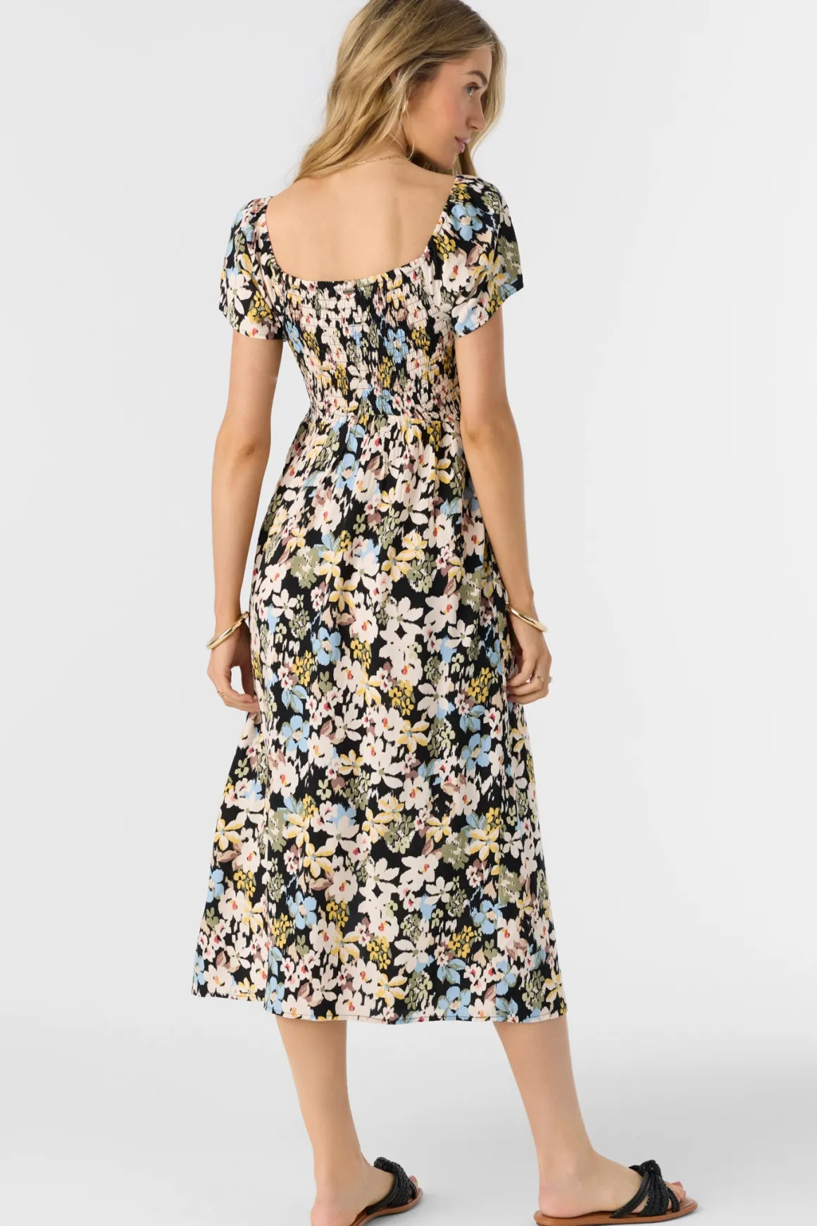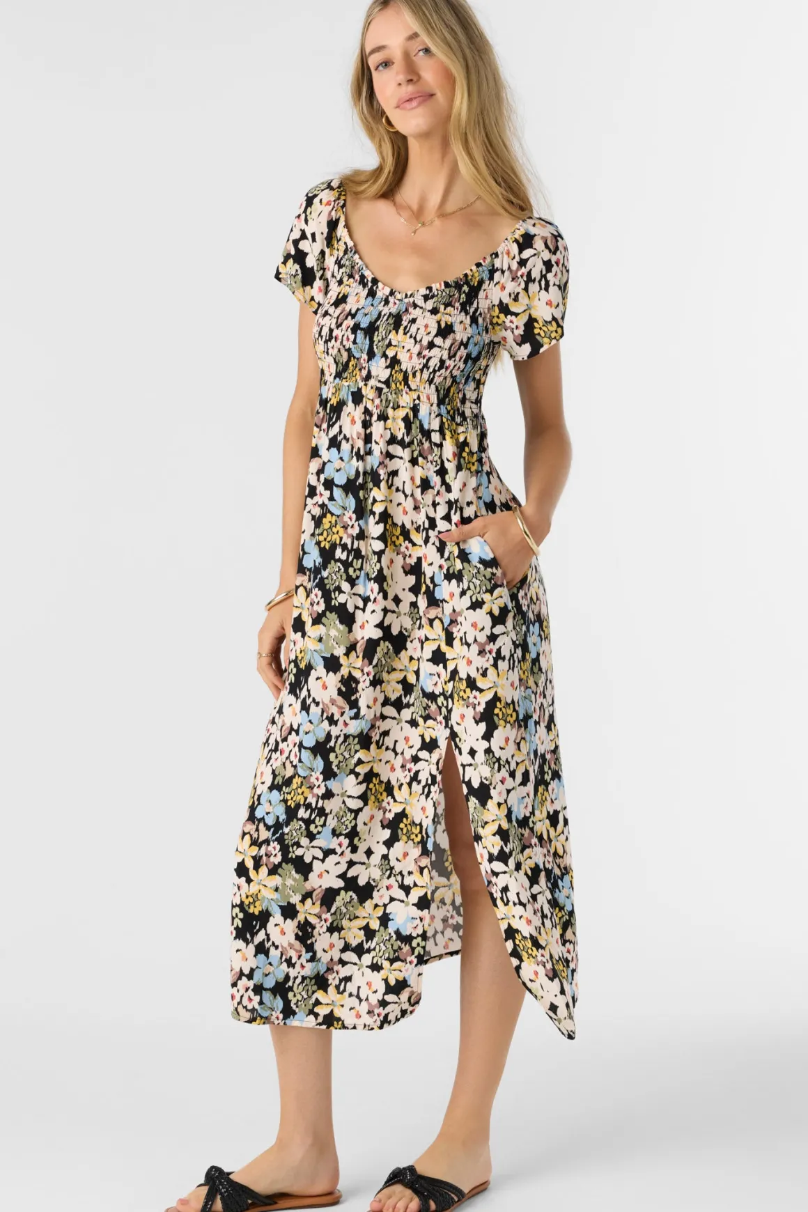 Sweet and stylish floral midi that has a relaxed, flowy fit, on seam pockets and a front slit detail.