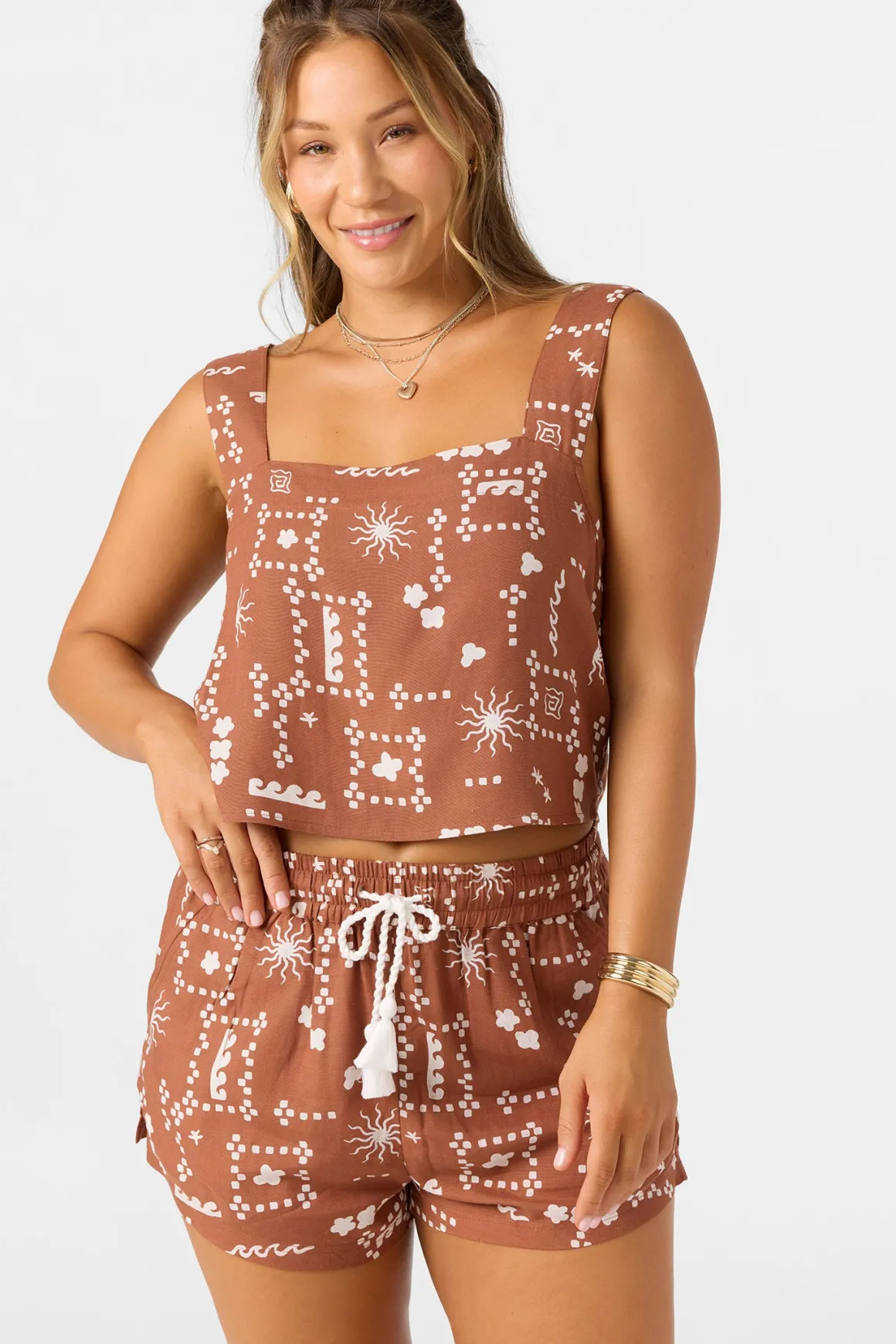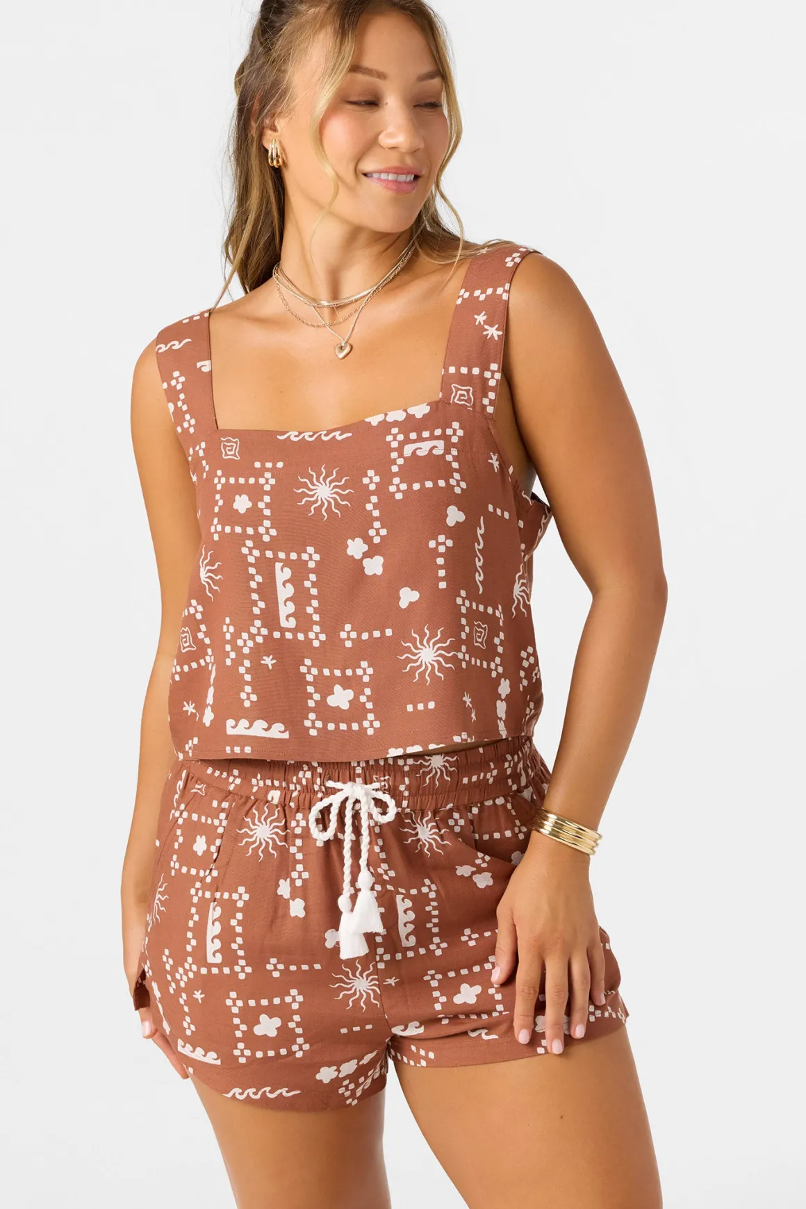 Ready for sunshine woven tank top that has a skimmer length fit, wide strap design and unique allover print.