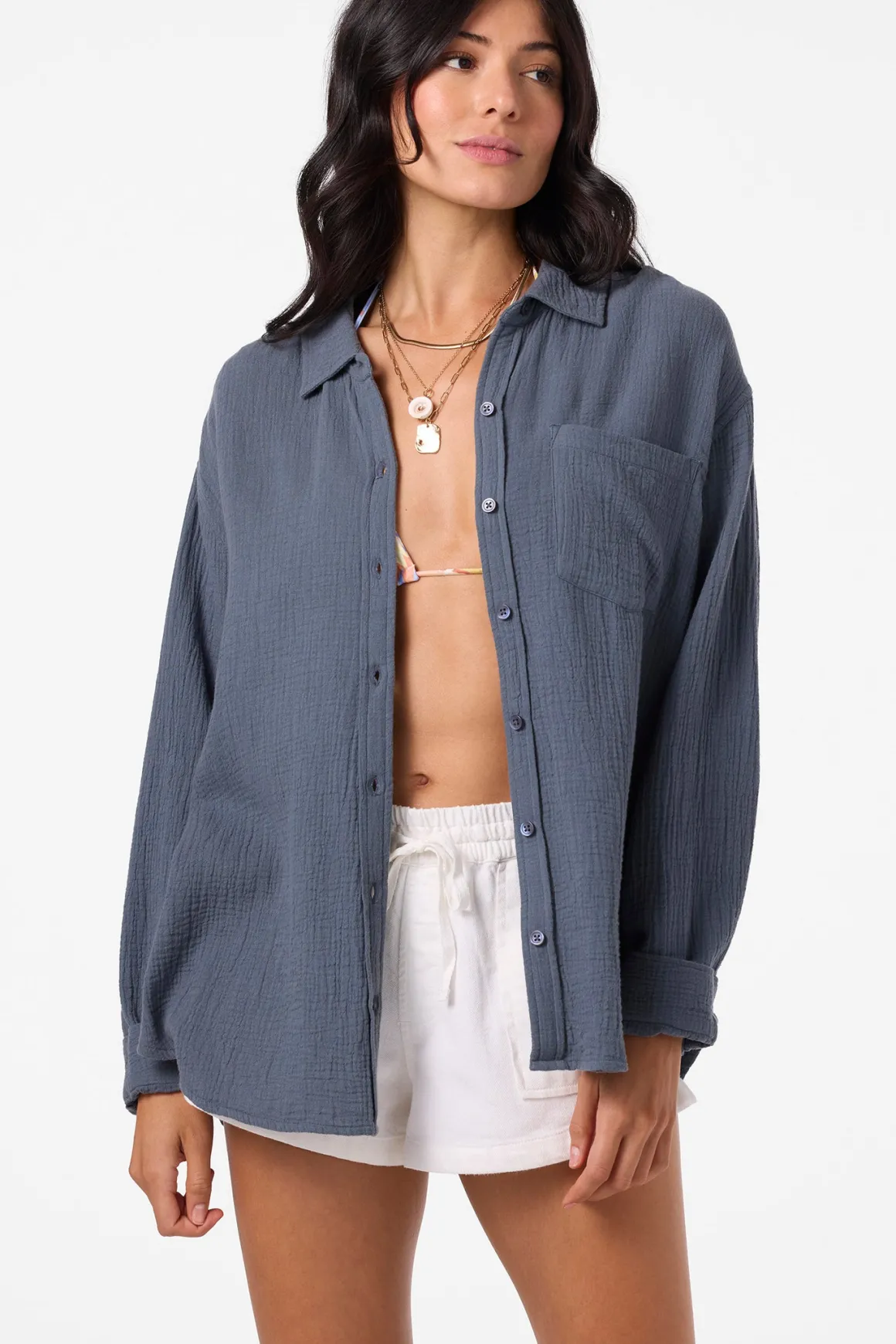 Effortlessly cool woven long sleeve top that has an oversized fit design, front button closure with collar and yarn dye solid wash.