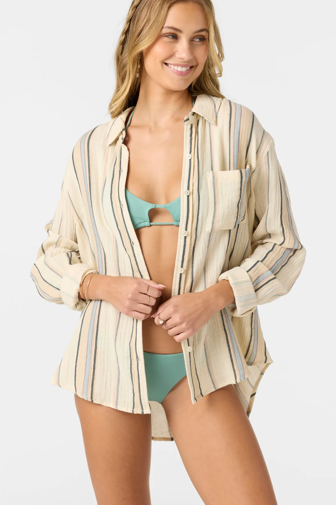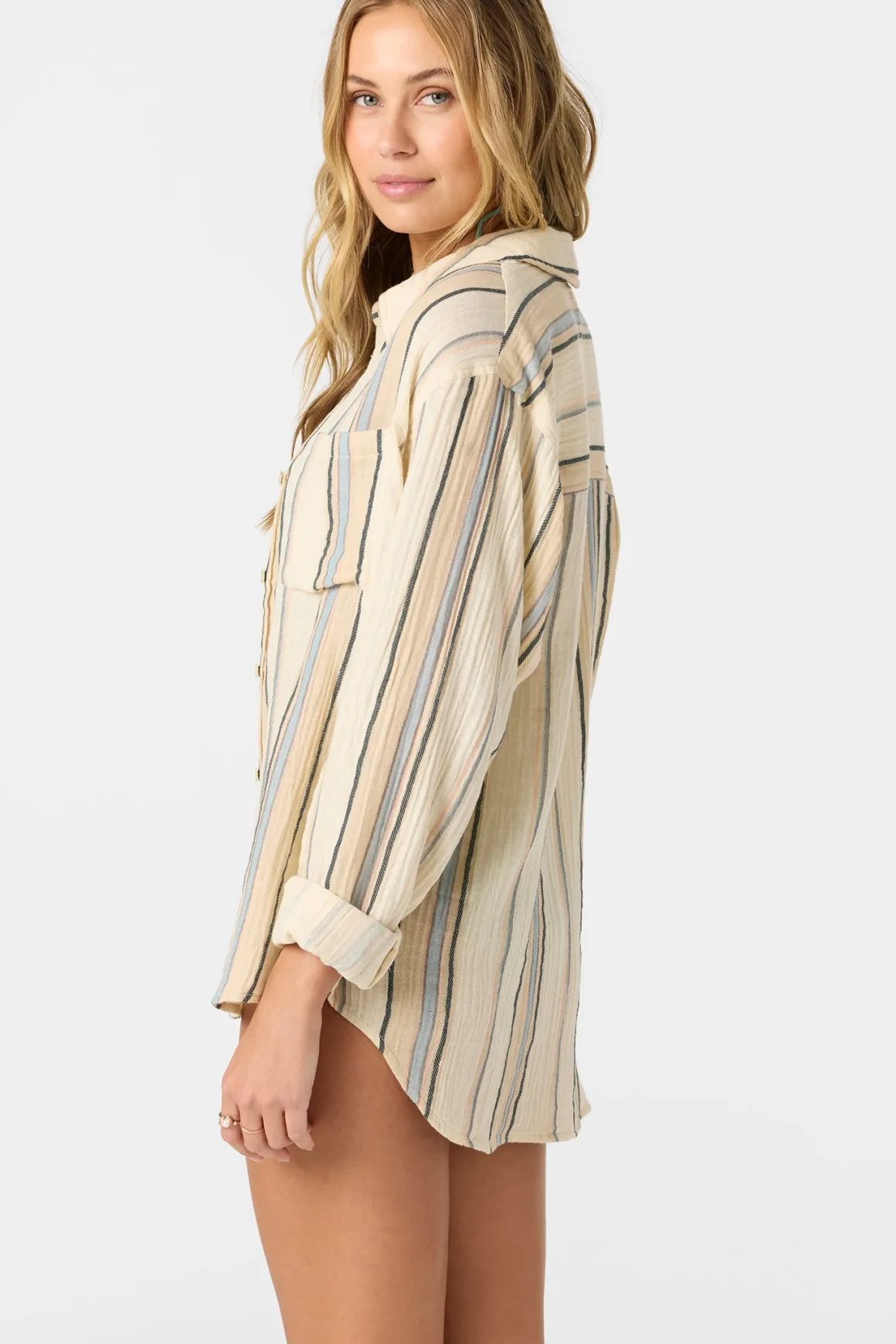 Effortlessly cool woven long sleeve top that has an oversized fit design, front button closure with collar and yarn dye stripe print.