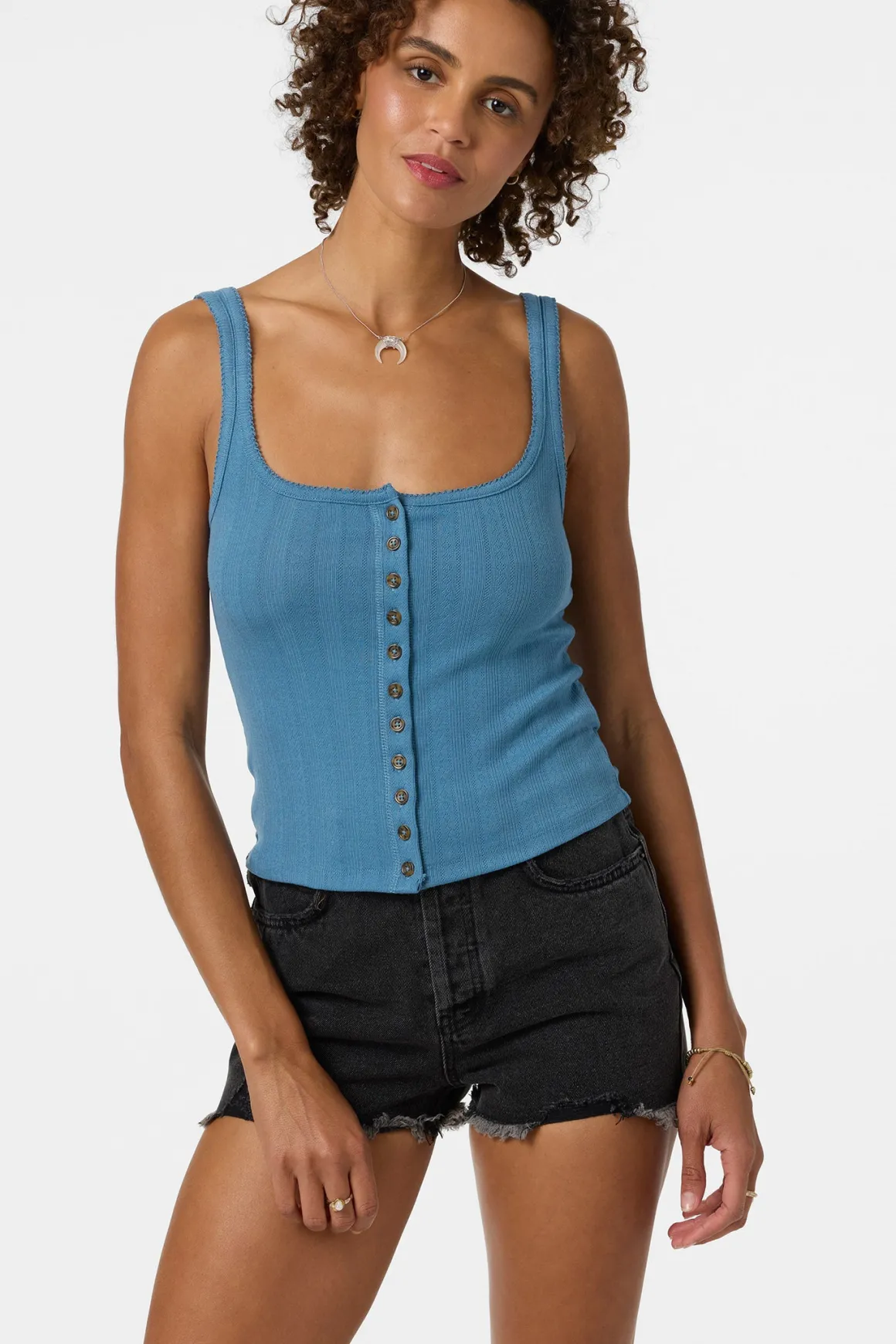 Ready for sunny days ahead. This lightweight knit tank features a solid color design, button front and intricate fabric detail.
