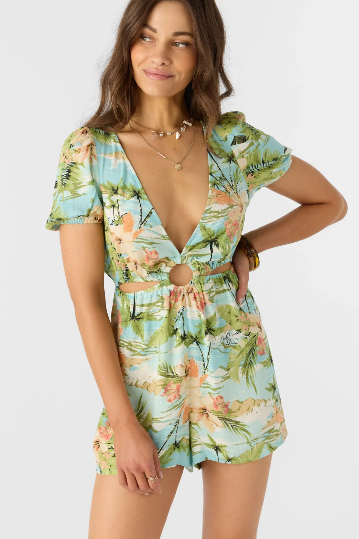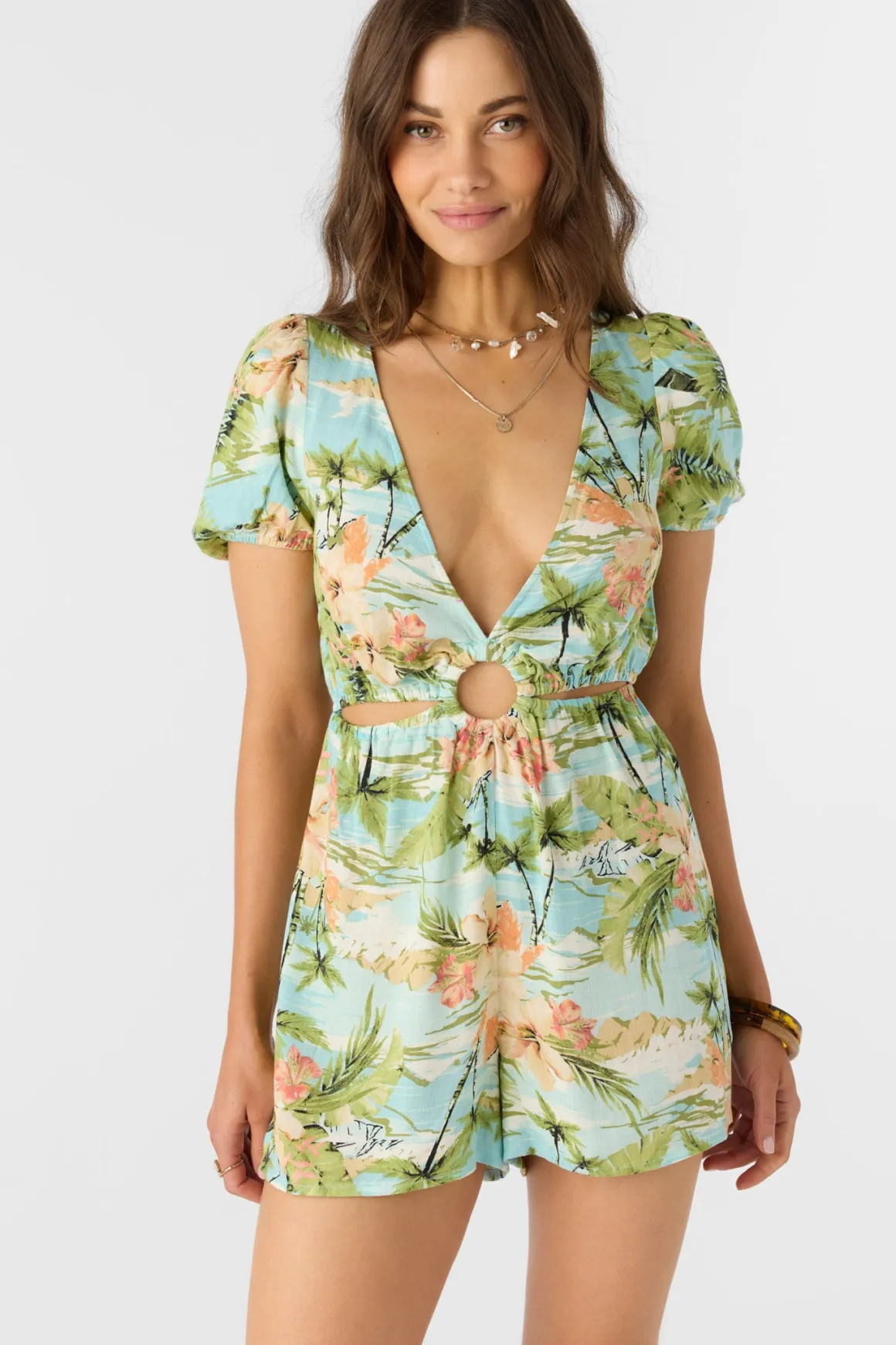 Step into warmer days with this head-turning romper that balances vintage charm and modern flair. The puff sleeves and deep V-neck create an alluring silhouette, while the elasticated cutouts and self-covered ring at the waist offer a playful design.